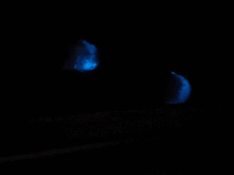 뜰채를 물에 담근 채 배가 달리기 시작한 지 얼마 되지 않아, 물속에는 정말 신기하게도 짙은 푸른빛이 반짝이기 시작했다. 새까만 강물 안에서 이렇게 밝은 빛이 나온다는 게 신기했다. 마침 전날부터 비가 안 와서인지 플랑크톤들이 강으로 많이 올라온 듯했다.