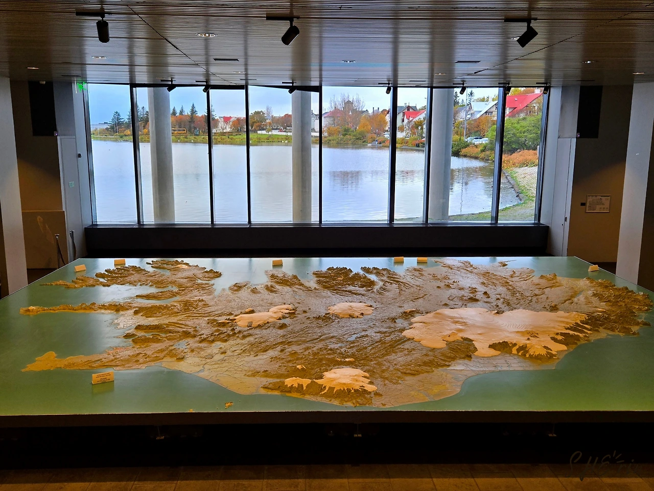 안에는 견학 온 걸로 보이는 학생들 무리가 있었다. 복도에 서서 학생들이 다음 장소로 이동하기를 기다린 뒤, 그들이 서 있던 곳으로 내려갔다. 입체적인 아이슬란드 지도가 있었다. 우리가 그동안 구경한 곳들, 그리고 앞으로 갈 곳들을 찾아보는 재미가 있었다. 이곳에서 창밖 너머로 호수를 바라보는 것도 좋았다. 들어가 보아야만 알 수 있는 풍경이었다.