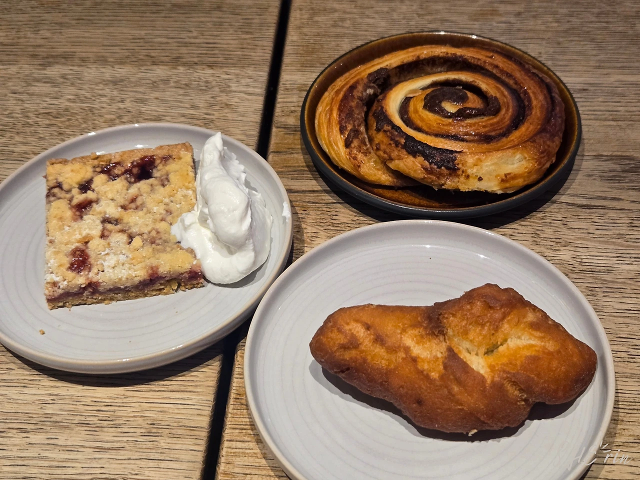 함께 주문한 빵들도 다 맛있었다. 아이슬란드식 디저트들로 고심해서 주문한 메뉴들이었다. 짧고 통통한 꽈배기 같은 클레이자(Kleina) 도넛은 레몬 들어간 느낌이라 상쾌한 느낌이 났고, 스누두르(Snúður)은 우리 가족이 모두 평소에도 좋아하는 시나몬롤이나 다름없어서 기대가 컸는데 은은하고 많이 달지 않아 부모님도 좋아하셨다. '행복한 결혼 케익'이라는 별명이 있는 루바브 케익(Hjónabandssaela)도 맛있었다. 루바브 케익은 10년 전 아이슬란드에서 처음 먹어보고 좋아하기 시작했던 메뉴라, 아이슬란드에 다시 오면 꼭 먹고 싶은 메뉴였다.