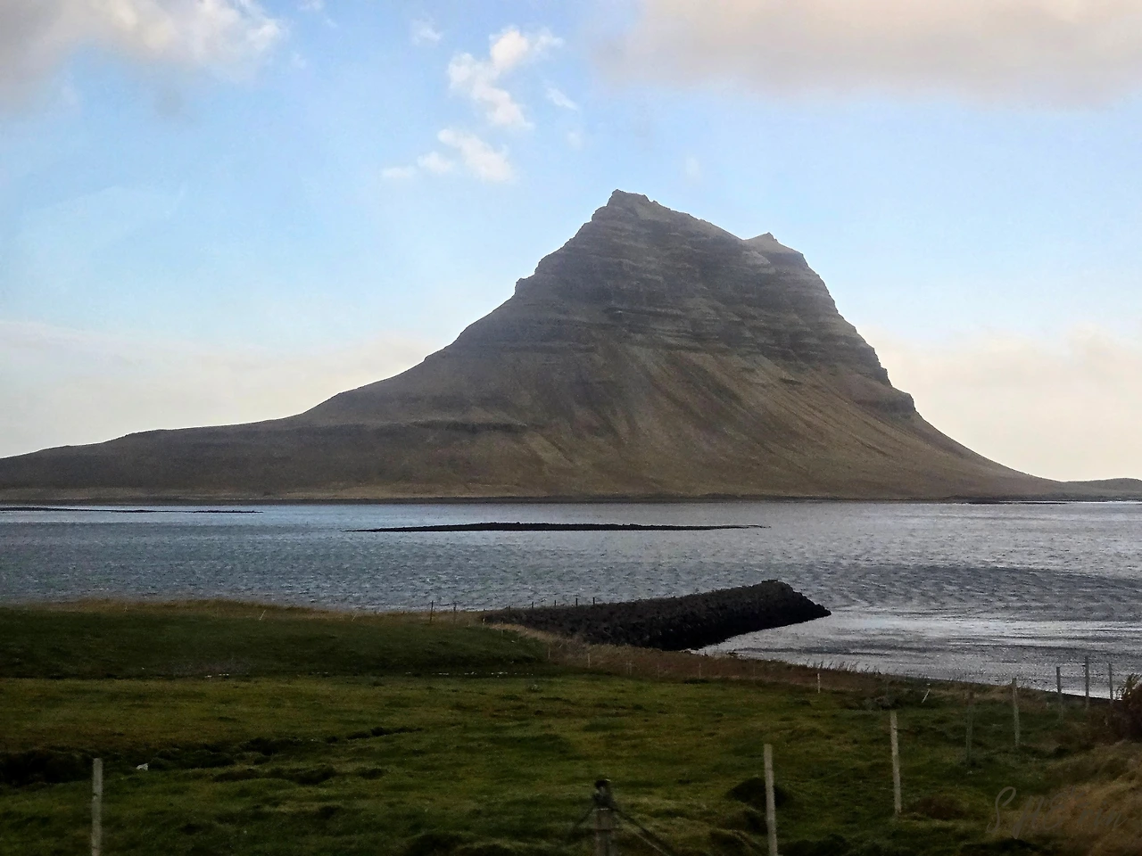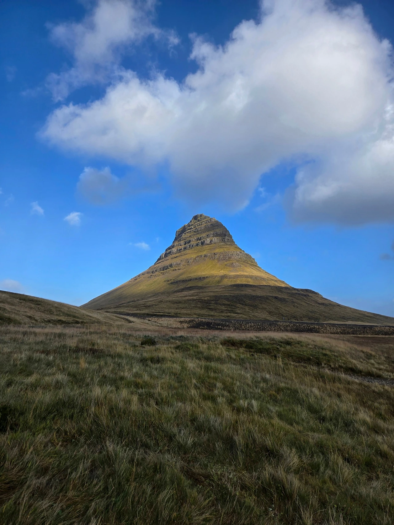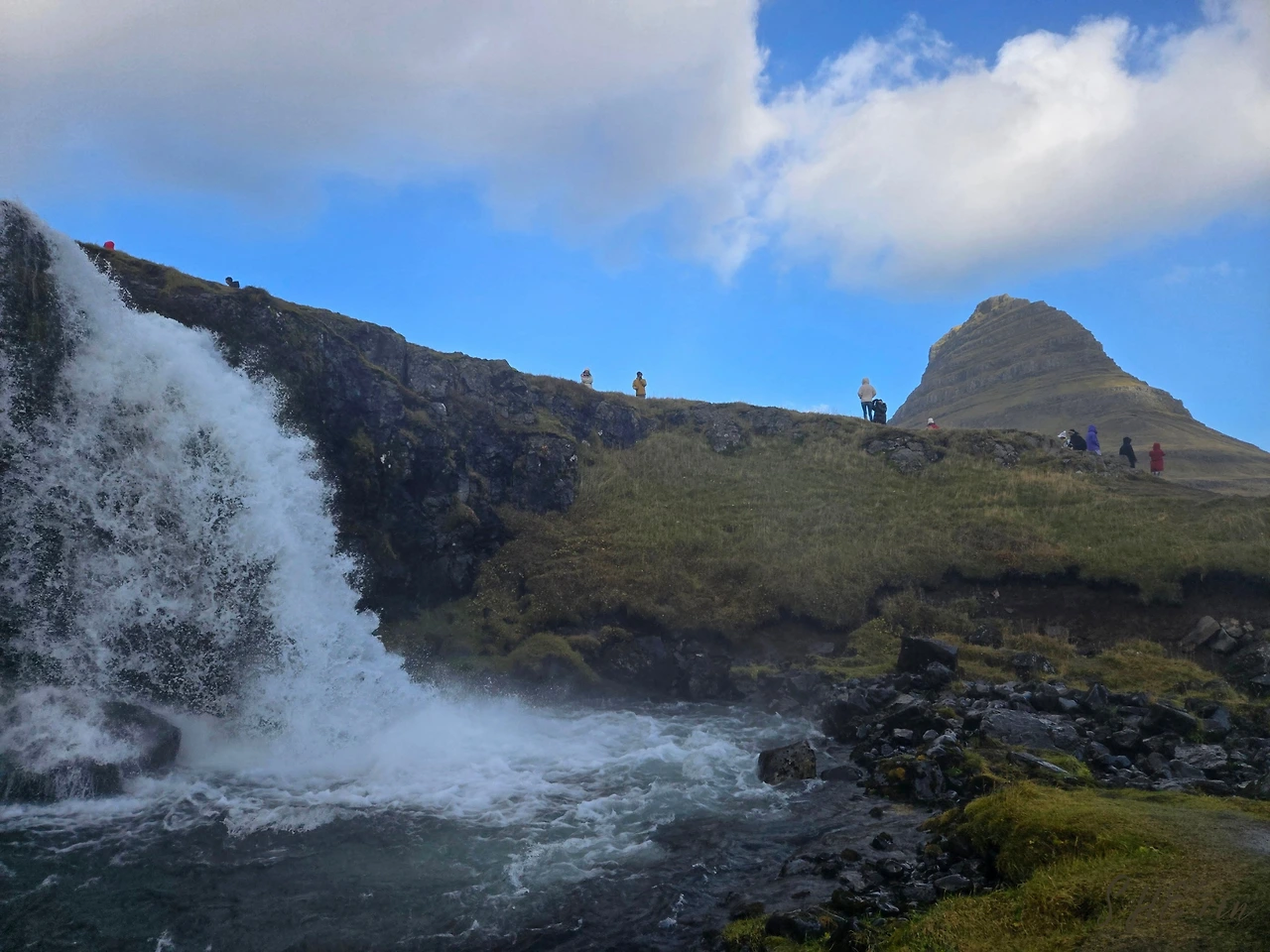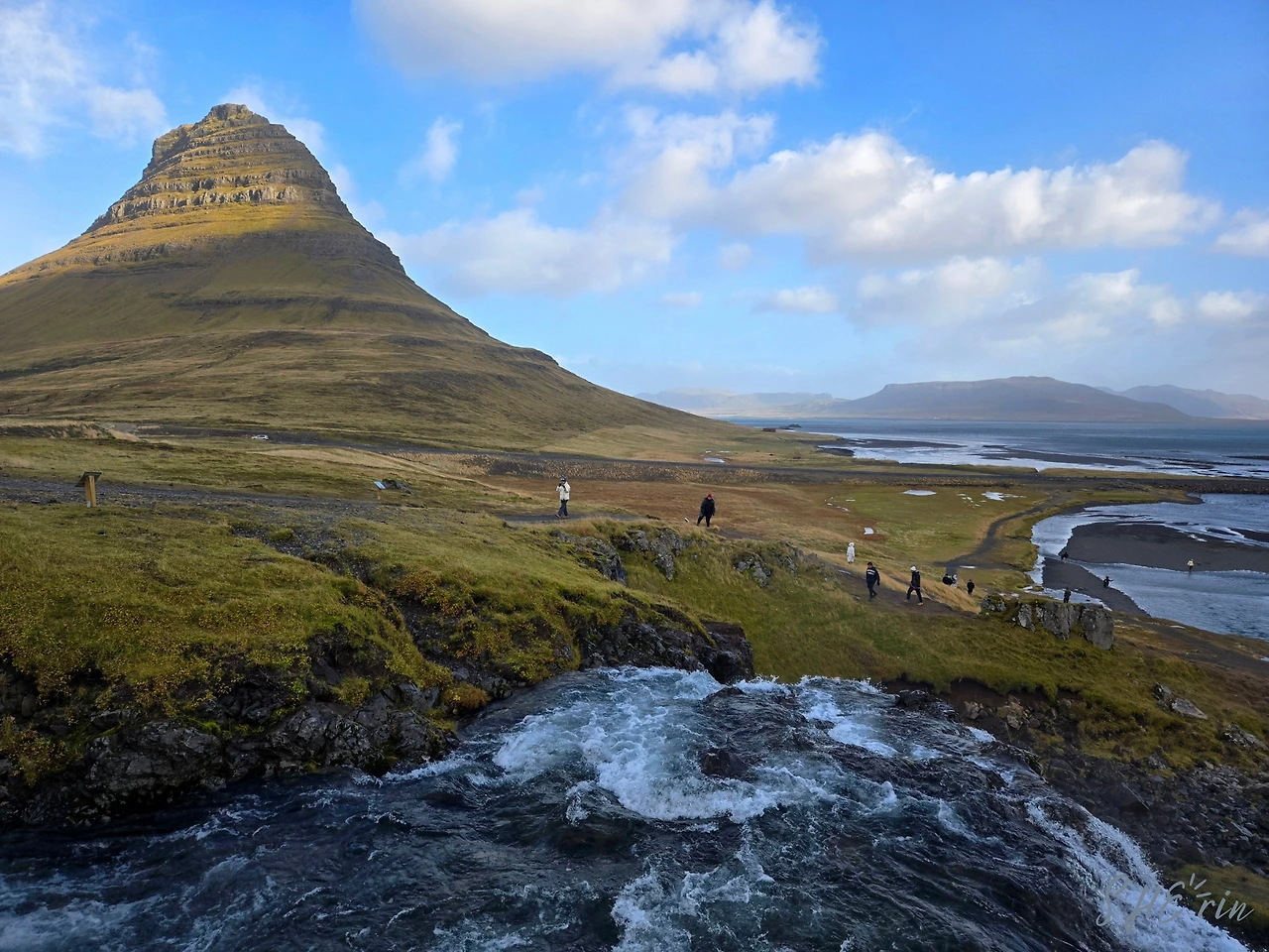 가장 먼저 내린 곳은 키르큐펠(Kirkjufell)이었다. 'church mountain'이라는 뜻을 가진 곳으로, 수많은 아이슬란드 여행 광고에 자주 등장하는 곳이다. 보는 각도에 따라 마치 뾰족한 고깔모자 같기도 하고, 위가 평평한 중절모 같기도 하다. 나는 아무리 봐도 모자 같은데 그 뾰족한 모양 때문에 교회 같다는 이름이 붙었다고 한다.