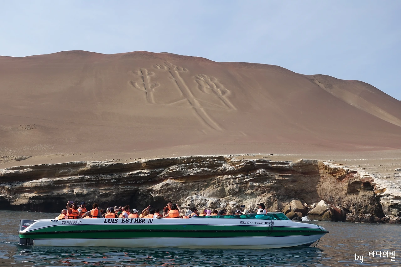 배를 타고 가장 먼저 간 곳은 나스카 지상화 같은 칸델라브로(Candelabro, 촛대)가 있는 섬이었다. 멀리서도 보이는데, 가까이 다가가면 그 크기가 조금이나마 실감이 난다. 나스카에 가기 전이었기 때문에 더욱 신기하게 느껴졌다. 염도 높은 바람으로 그림이 지금까지 남아있을 수 있는 것이라고 한다.