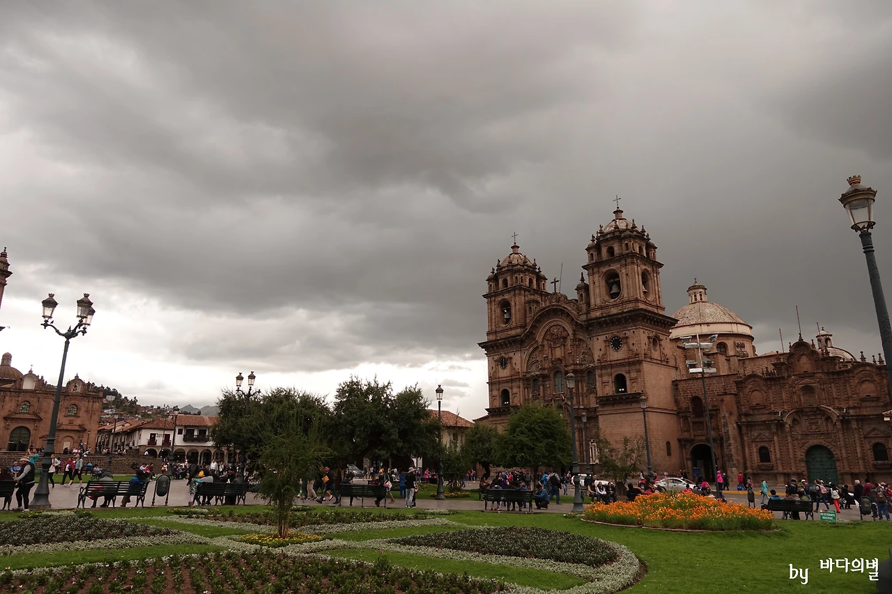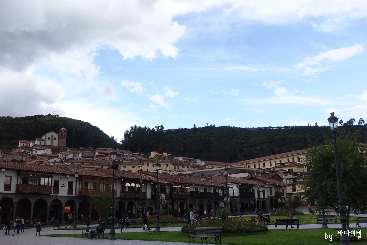 밝은 빛깔이 가득했던 리마와는 전혀 다른 분위기였다. 그렇다고 해서 쿠스코 자체가 어두웠던 것은 아니다. 날씨가 쿠스코의 밝은 면을 잠시 가렸을 뿐, 오래된 건물들의 어두운 색감이 적당히 무게를 잡아주는 반면, 광장의 풀밭은 화창함을 지니고 있었다. 리마의 아르마스 광장에 비해 규모는 크지 않았지만 훨씬 웅장한 느낌이었다.