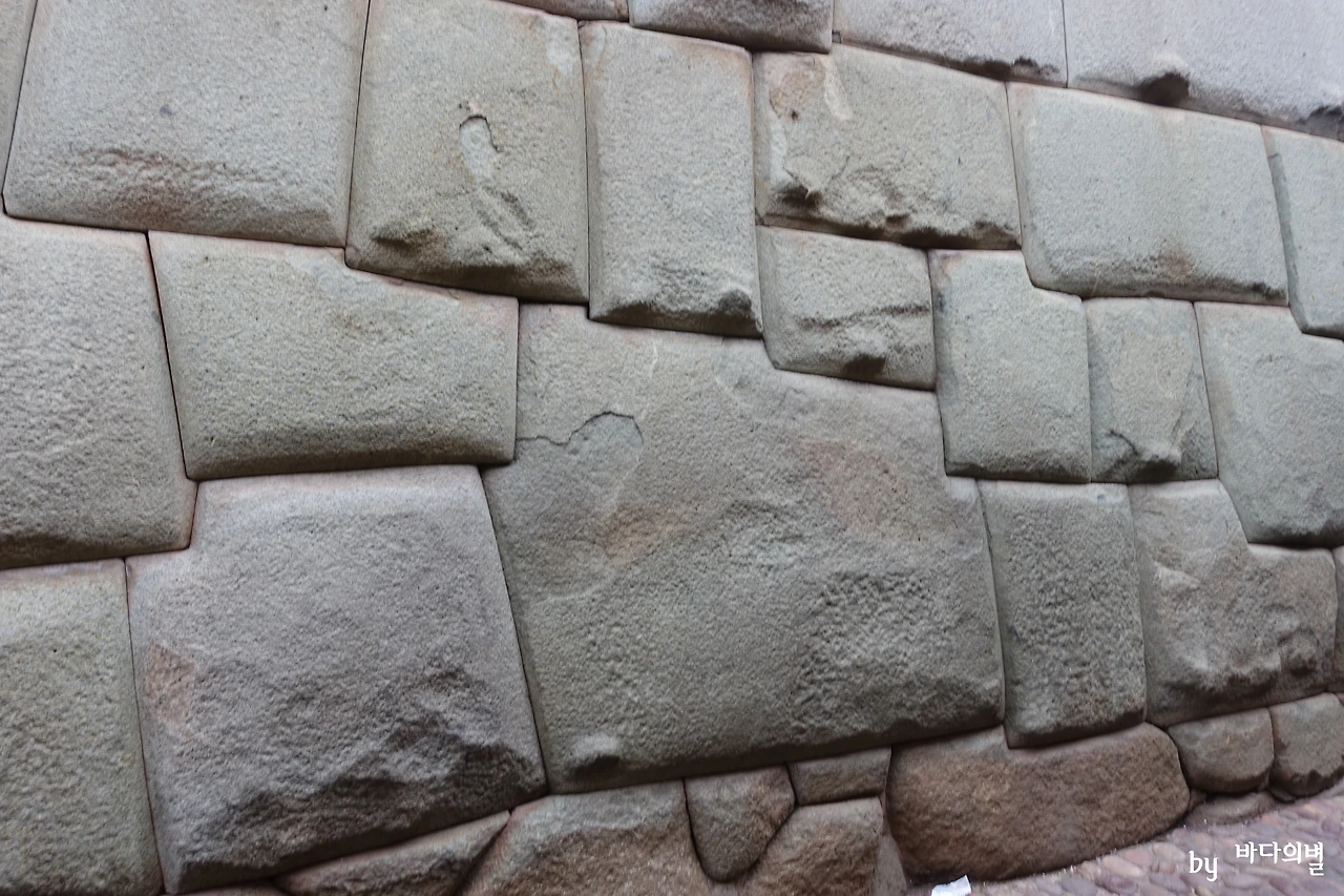 이 수많은 돌들 중에도 스타는 있다. 제각각 다른 모양의 돌들 사이에서 가장 많은 각을 자랑하고 있는 12각돌. 아무런 표시가 없어서 이 벽에 있는 것을 몰랐다면 찾지도 못했을 것 같다. 게다가 아래쪽에 위치해서 더욱 눈에 띄지 않았다. 몇 개의 큰 돌들의 각을 일일이 세어본 뒤에야 발견했다. 어쩜 이렇게 돌을 딱 맞게 제작했는지, 정말 놀라웠다. 다음날 쿠스코 근교 유적지 투어 때 들은 거지만 처음에는 작은 돌들을 쌓아 올리는 방식으로 벽을 만들었고 중반에는 돌들 사이에 시멘트 같은 것을 발라 올리는 식이 되었고, 나중에는 이런 식으로 돌을 깎아 딱 맞게 만들어서 끼워 맞추었다고 한다.
