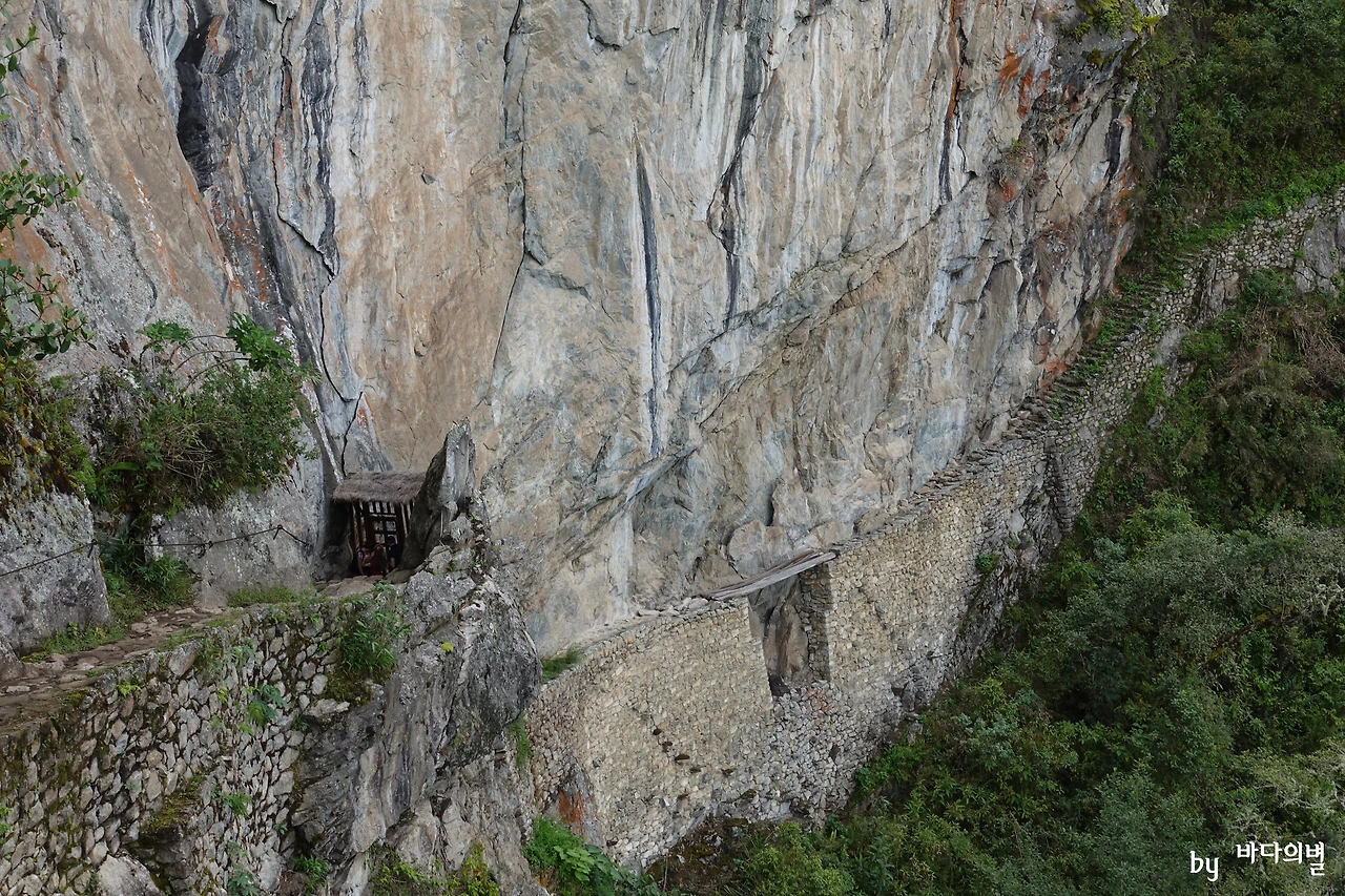 잉카 브리지 바로 앞은 단단하게 막아놔서 시야가 막혀 있다. 제대로 보려면 오히려 조금 멀리 떨어져서 보는 것이 더 낫다. 중간 부분을 나무로 연결해놓은 것은 적들이 올 경우를 대비한 것으로 보였다. 낭떠러지 길의 모습이 아찔해 보였다.