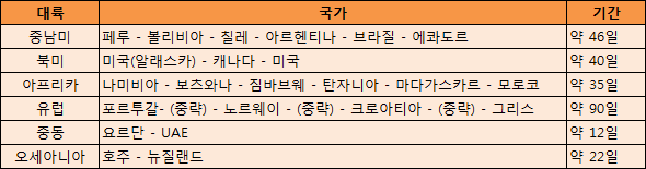 사실 중동이나 북미에서 출발하는 것이 항공권을 더 절약할 수 있겠지만, 우유니 사막을 제대로 보기 위해서는 겨울에 가는 것이 좋고, 북미 역시 눈이 조금 녹은 뒤에 보는 것이 더 좋을 것 같아 결국 중남미 - 북미 - 아프리카 - 유럽 - 중동 - 오세아니아 순으로 잡게 되었다.