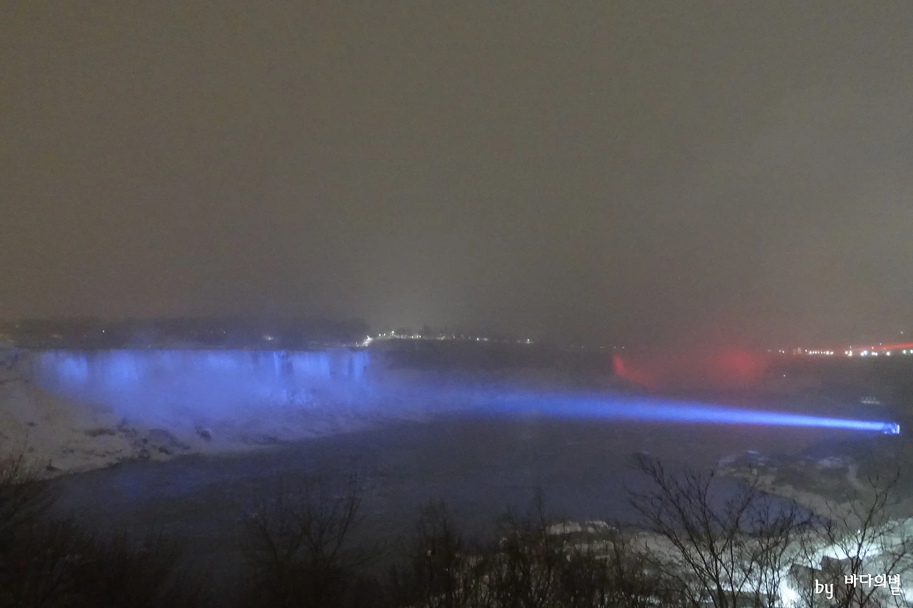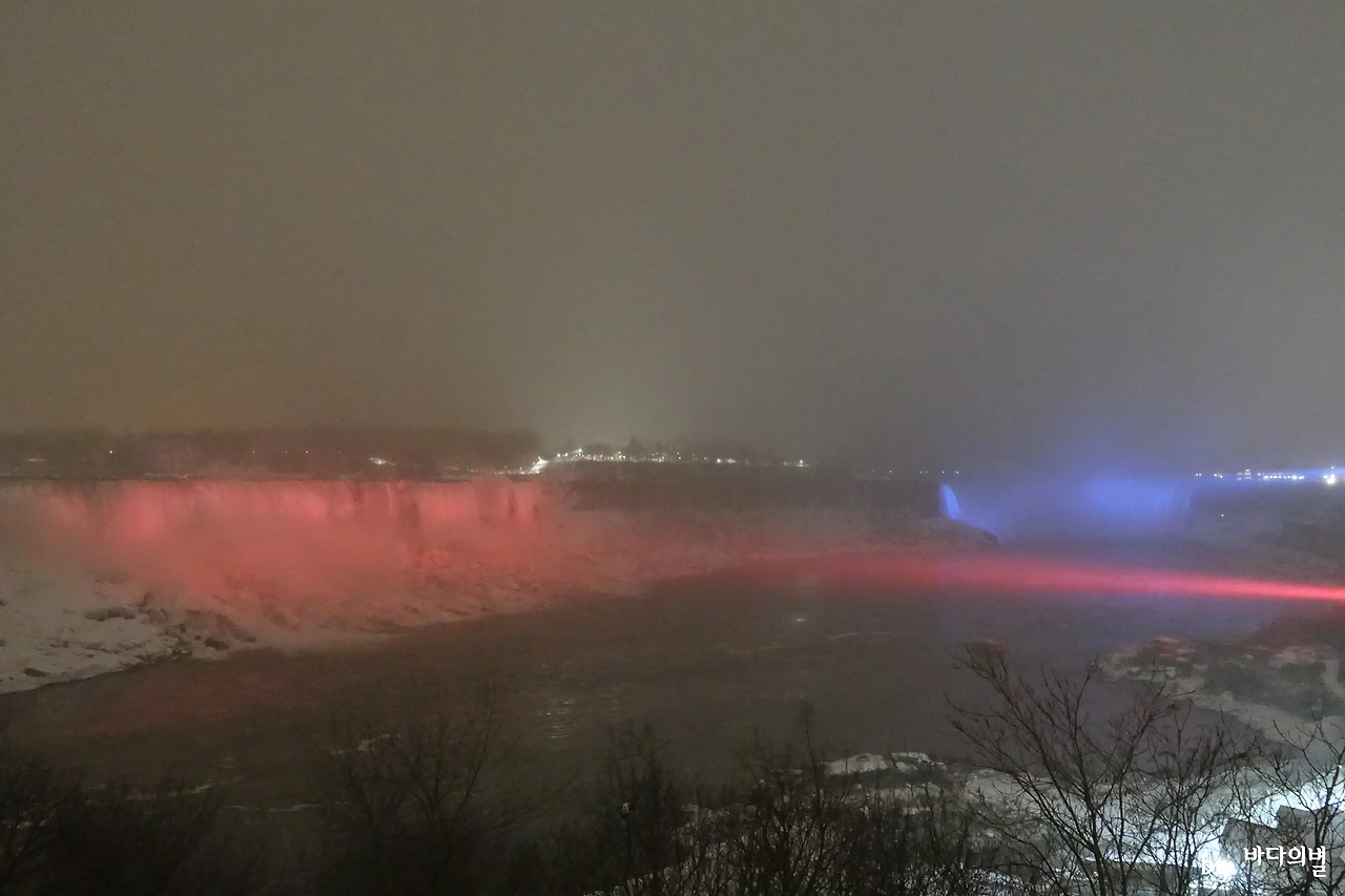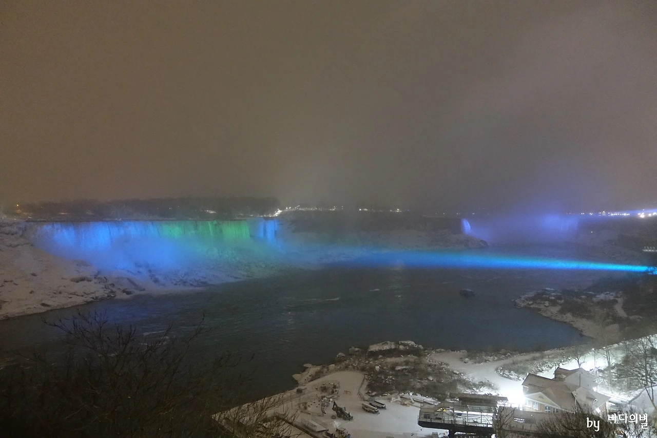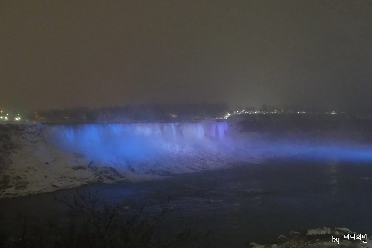 저녁 식사를 하고 폭포의 야경을 보러 걸어가 보았다. 폭포에 색색의 불을 비추어준다고 해서 시간 맞추어 간 것이었다. 이걸 보기 위해 온 사람은 나를 제외하고 4명이 있었다. 그중 아이를 데리고 온 젊은 엄마는 옆에 혼자 서 있던 다른 사람에게 혹시 불이 몇 시에 켜지는지를 물어보고 있었다. 그 사람이 모르길래 내가 다가가 8시 반이라고 알려주었다. 그렇게 눈보라를 뚫고 나이아가라를 찾은 사람들끼리 불이 켜진 나이아가라를 보며 조곤조곤 수다를 떨다 흩어졌다.