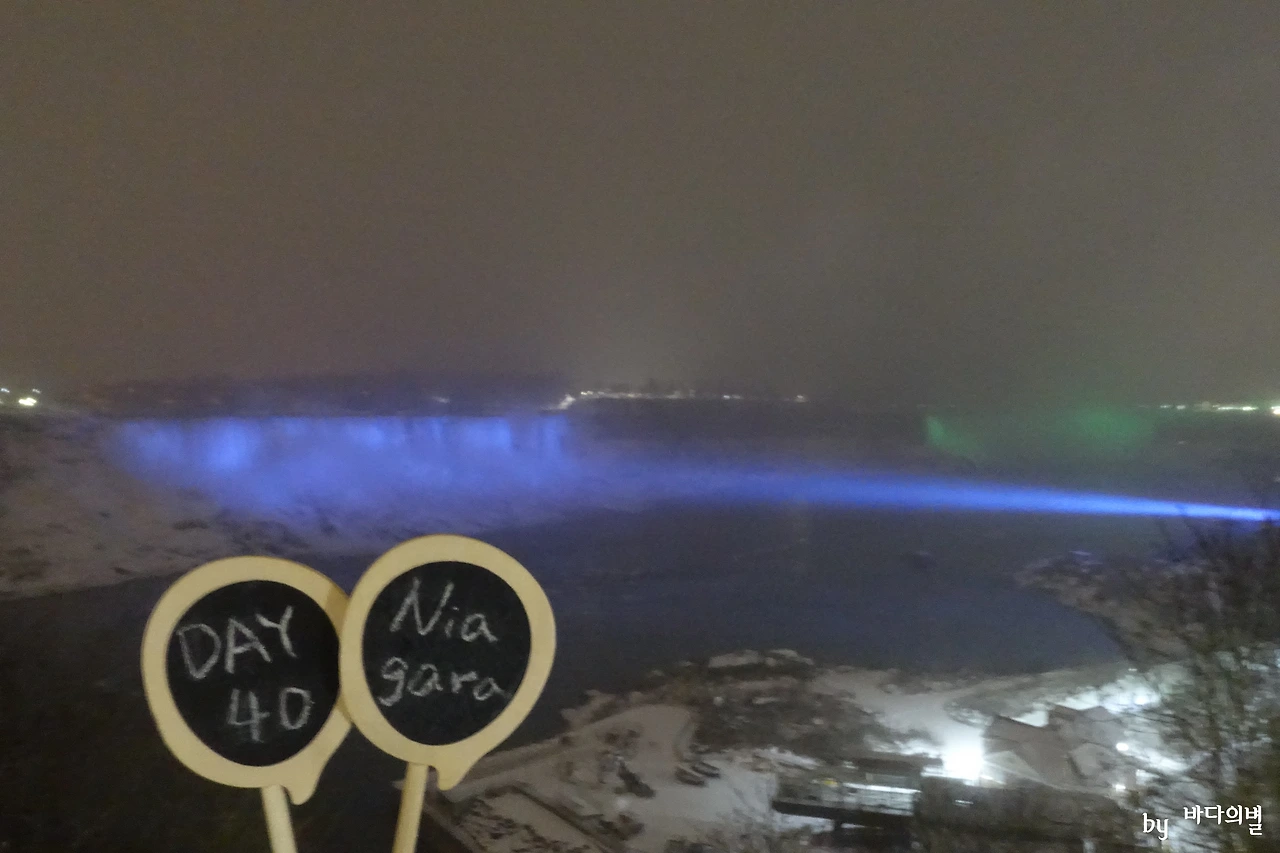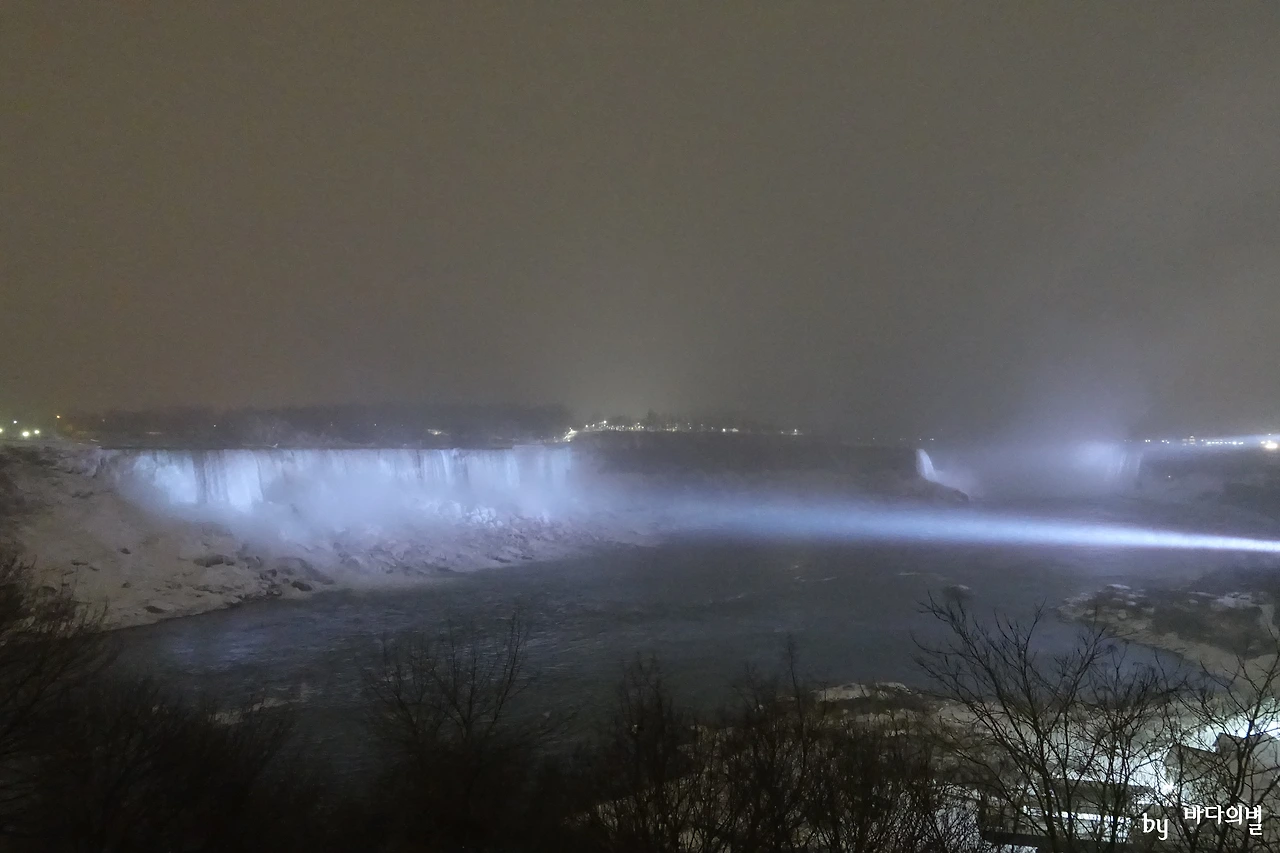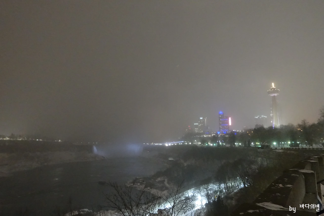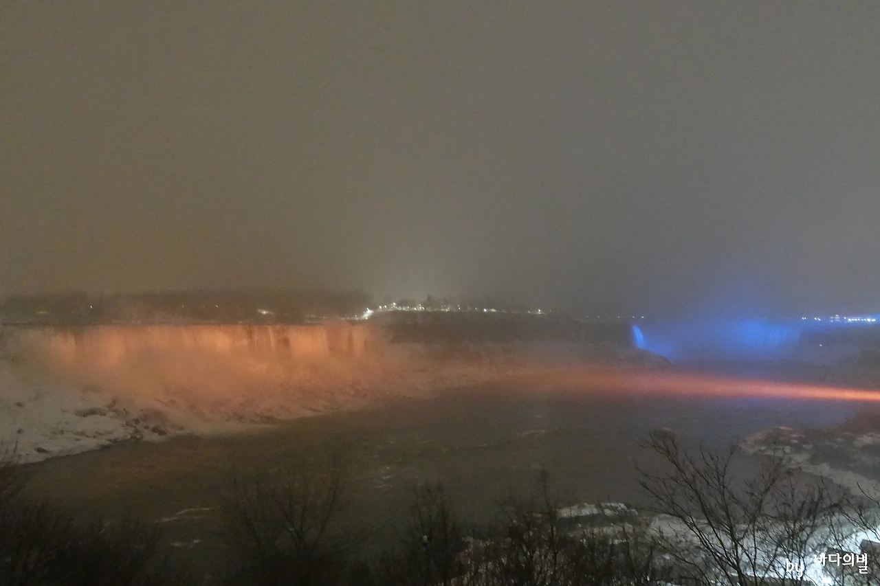 저녁 식사를 하고 폭포의 야경을 보러 걸어가 보았다. 폭포에 색색의 불을 비추어준다고 해서 시간 맞추어 간 것이었다. 이걸 보기 위해 온 사람은 나를 제외하고 4명이 있었다. 그중 아이를 데리고 온 젊은 엄마는 옆에 혼자 서 있던 다른 사람에게 혹시 불이 몇 시에 켜지는지를 물어보고 있었다. 그 사람이 모르길래 내가 다가가 8시 반이라고 알려주었다. 그렇게 눈보라를 뚫고 나이아가라를 찾은 사람들끼리 불이 켜진 나이아가라를 보며 조곤조곤 수다를 떨다 흩어졌다.