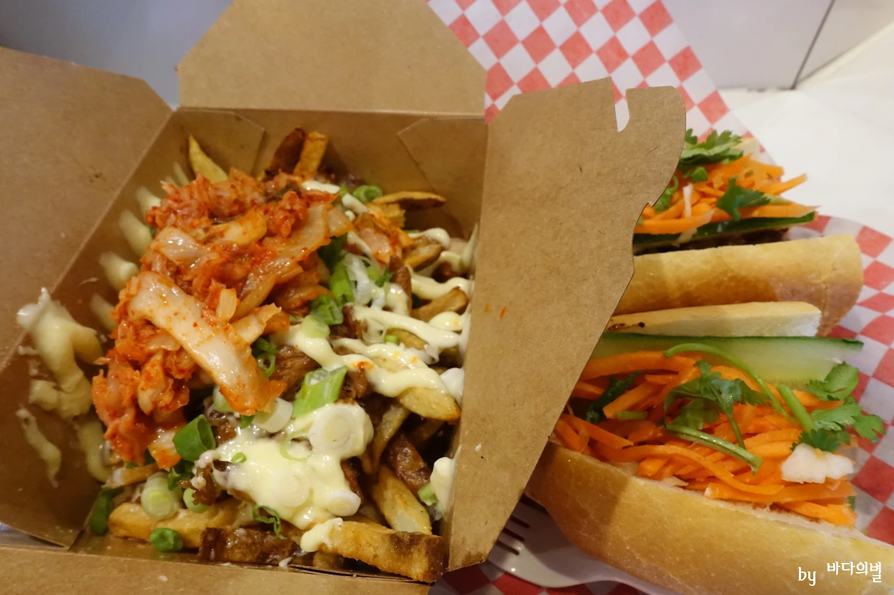 짧은 구경 후 먹은 것은 김치 프라이. 베트남 음식을 주로 파는 한 아시아 패스트푸드점에서 판매하는 음식이다. 감자튀김에 마요네즈, 그리고 볶은 김치가 올라가는 이상한 음식이다. 그런데 한 입 먹는 순간 너무나 이상하게 맛있었다. 음식 재료들이 전혀 조화롭지 않을 것 같았는데 볶은 김치의 아삭함이 감자튀김의 식감과도 잘 어울리고, 김치가 적당히 마요네즈의 느끼함을 잡아주어 정말 맛있었다. 오히려 함께 주문한 베트남식 샌드위치인 반미는 그리 맛있지 않아서 김치 프라이를 다 먹고 반미는 남겼다.