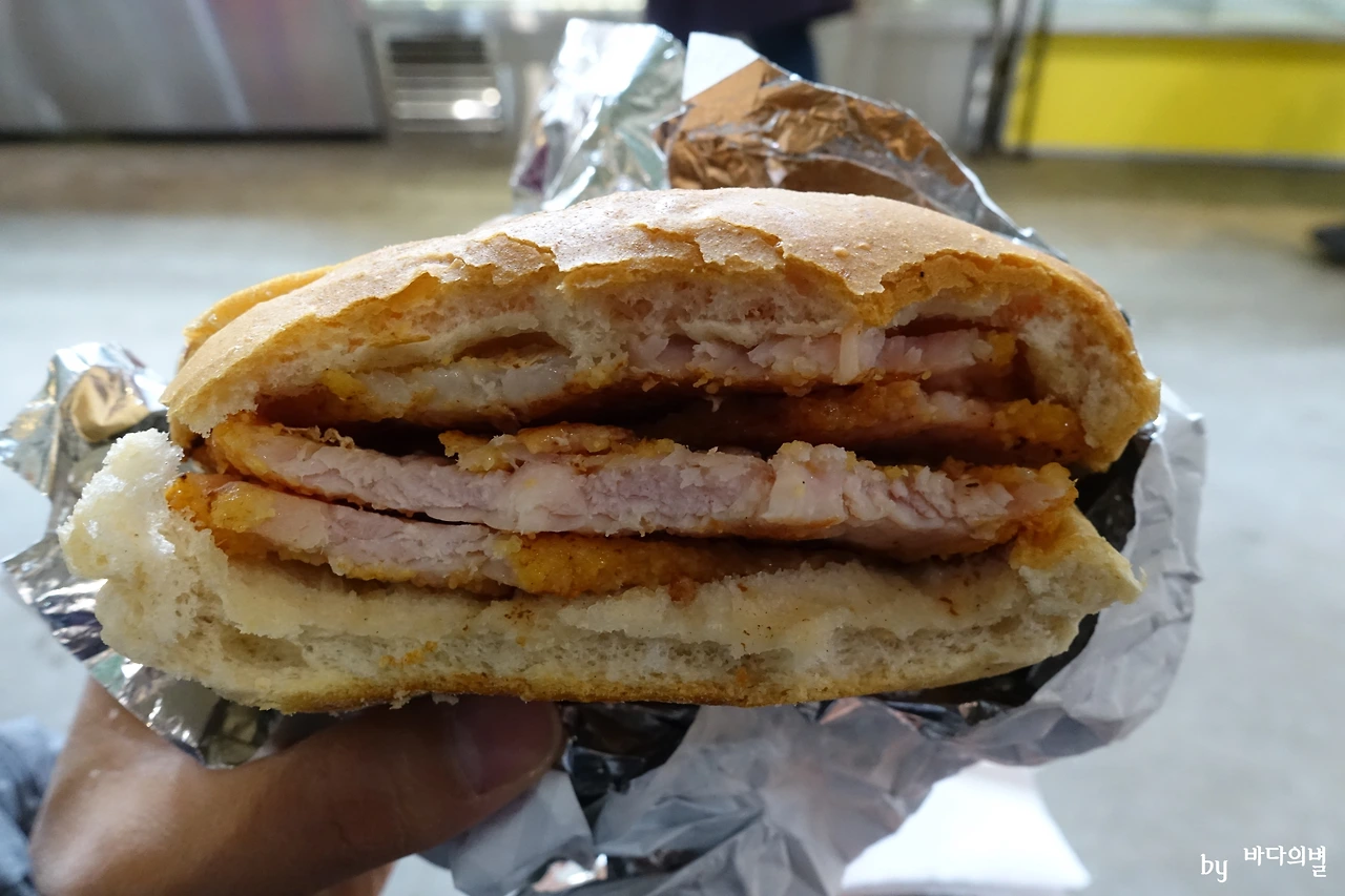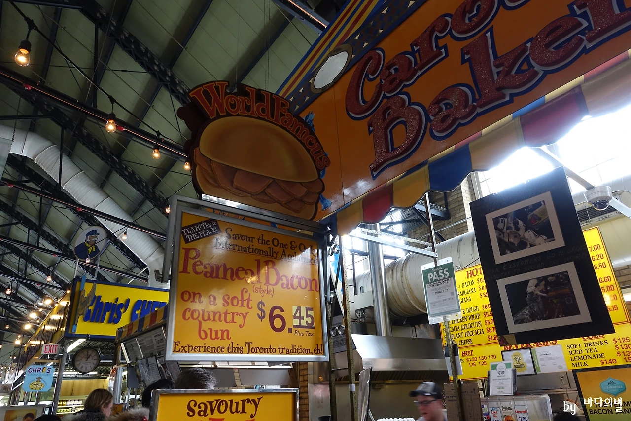 이곳의 명물은 토론토 전통 음식인 피밀베이컨(Peameal Bacon)으로 만든 샌드위치인데 투박하게 생겼지만 맛이 좋았다. 베이컨이라기보다는 패티처럼 두툼한 고기가 여러 장 가득 들어있어 양도 많았다. 많이 먹다 보니 퍽퍽하기도 했지만 처음 절반은 굉장히 맛있게 먹었다.