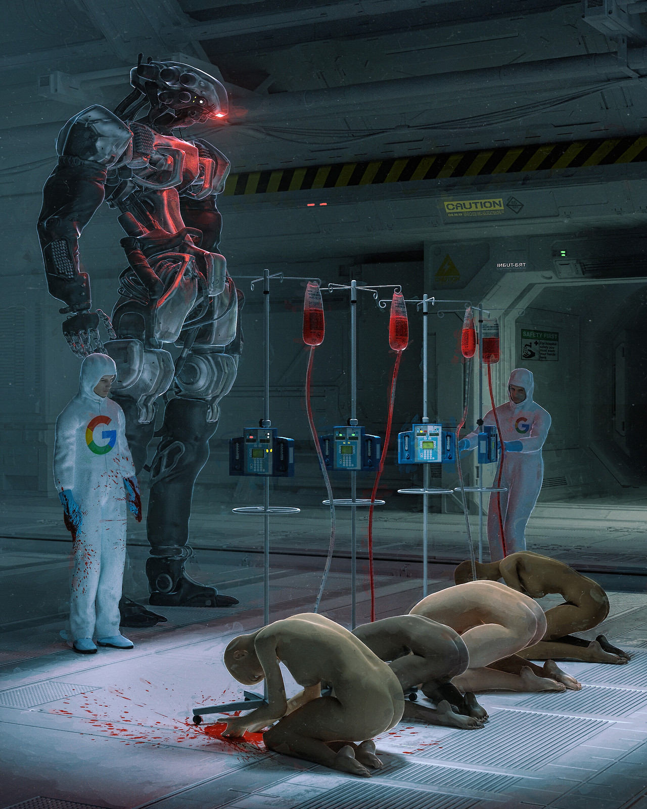 비플은 그림을 그리면서도 디지털 영상 작업을 꾸준히 했고 시대가 변하면서 자신의 작품을 적용할 NFT아트에 발 빠르게 적응했습니다. 그는 다가올 미래의 새로운 기술이 인간의 삶에 줄 지도 모를 변화에 주목합니다. 기술은 삶을 편리하게 하지만, 인간에게 꼭 이로울 수만은 없다는 점을 상기시킵니다. 세상을 지배하는 구글, 아마존, 애플, 메타의 창업자들을 작품에 등장시켜 막강한 파워, 그리고 그들에 대한 두려움을 드러냅니다. 'Google Data Collection 2098'에는 바로 그와 같은 생각이 고스란히 드러나 있죠. 우리는 구글에서 검색을 하고 유튜브를 시청하는데 어느새 구글은 우리의 취향, 소비패턴 등을 우리 자신보다도 더 정확히 압니다. 어디서 누구를 만나고, 무엇을 보고, 어디로 이동하는지, 심지어 우리의 은밀한 사생활조차 모두 알고 있죠. 우리 자신도 인지하지 못한 행동 패턴을 데이터화해 비즈니스에 활용하고 있는 것도 사실입니다.