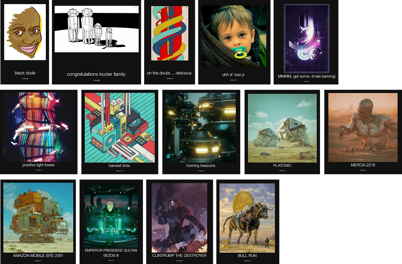이 커다란 작품은 너무나 많은 그림들이 한 화면에 담겨 어떤 작품들이 있는지 제대로 살펴보기가 어려울 정도입니다. 이 때문에 비플은 자신의 웹사이트 beeple-crap.com 에 개별 작품들을 볼 수 있도록 라운드별(장르별)로 분류해 놓았어요. 라운드 1이 초기 작품들이며 라운드 14가 가장 최근의 작품들인데 라운드 14 이후 최신 작품들은 주로 자신의 인스타그램을 통해 공개하고 있습니다. 작품 형식은 최근으로 올수록 CINEMA 4D(3D 모델링 프로그램)를 이용한 작품들이 많지만 라운드 초기에는 종이에 그린 드로잉 작품, 라운드 4는 사진 작품으로 구성되어 있습니다.