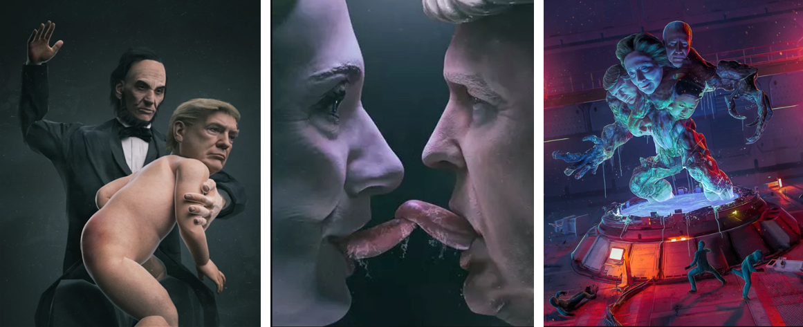 Shitty Kid(왼쪽) | Happy Halloween(가운데) | Real Virus(오른쪽)작품 ‘Shitty Kid’에서는 미국의 16대 대통령인 에이브러햄 링컨이 전 미국 대통령 트럼프의 볼기짝을 때리고 있습니다. 링컨이 미국 첫 공화당 출신 대통령이며 트럼프 역시 공화당 대통령이라는 점을 고려해 볼 때 트럼프가 공화당의 가치를 훼손하고 있음을 모두의 존경을 받는 대통령을 통해 훈계하고 싶은 모양입니다. 작품 ‘Happy Halloween’에서는 미국 양당의 대통령 후보였던 민주당 힐러리 클린턴과 공화당 도널드 트럼프의 혓바닥을 끈적하게 붙여 놓았는데요. 그들은 겉으로는 서로 다른 가치를 대변하는 것 같지만 자신들의 정치적 이익을 지키고 표를 얻기 위한 욕망을 추구한다는 점에서는 그 누구보다 가까운 동업자일지도 모릅니다. 그래서인지 서로 잡아먹을 듯 으르렁거리는 양당 수장의 혀가 서로를 끈적하게 핥고 있네요. ‘Real Virus’에서는 클린턴, 트럼프, 조 바이든, 김정은을 한 몸뚱이로 붙어 있는 바이러스로 그려 냈습니다. 마치 "너희들은 다 한 통속이야!"라고 외치는 것 같네요. 매일같이 전쟁, 환경, 핵 이슈 등으로 인류를 불안하게 하는 위정자들을 징그러운 바이러스와 괴물로 묘사해 그들이야말로 바이러스라며 싸잡아 비난합니다. 그럴 만도 하죠. 회담도 여러 차례, 협정도 여러 차례, 뉴스는 매일 같이 나오지만 큰 진전이 보이지 않고 여전히 그들 소수의 결정에 따라 인류 전체의 평화가 좌지우지되니 말입니다.