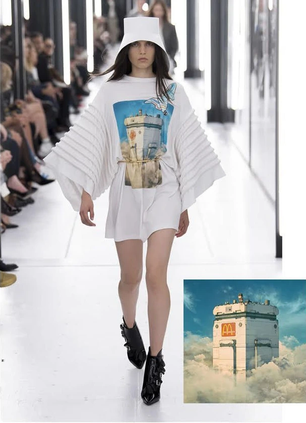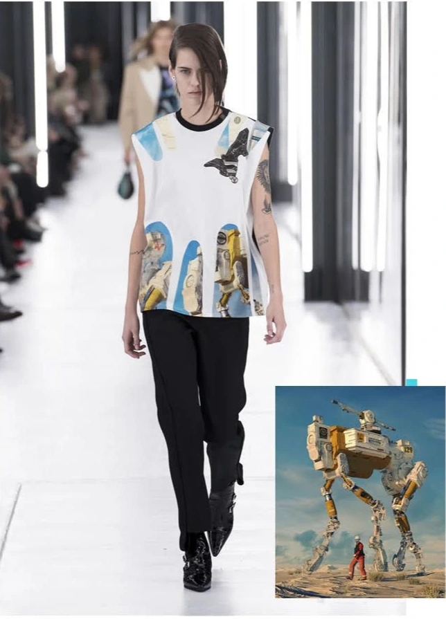 루이뷔통 패션쇼에 등장한 비플 작품여성용 티셔츠에 비플의 그림 몇 개를 사용하고 싶다는 제안을 했는데 패션에 대해 전혀 몰랐던 비플은 자신의 작품이 어떻게 사용될지 궁금했다고 합니다. 미래와 테크놀로지를 주요 소재로 한 비플의 작품이 럭셔리 패션 브랜드에 어떻게 적용될지 바로 떠올리긴 쉽지 않습니다. 놀라운 점은 루이뷔통이 택한 작품은 추상이미지나 패턴이 아닌 구체적인 로봇 그림을 적용했다는 점입니다. 'Everydays' 시리즈에서 9개의 디지털 일러스트가 루브르 박물관에서 열린 파리 패션 위크 루이뷔통 쇼의 45개 제품 중 13개 제품에 사용되었는데 반응은 뜨거웠습니다. 협업 작품들 중 'MCD 2087'의 경우에는 원본 작품의 맥도널드 로고를 루이뷔통 로고로 바꾸어 패션쇼에 등장시켜 화제를 낳기도 했죠.