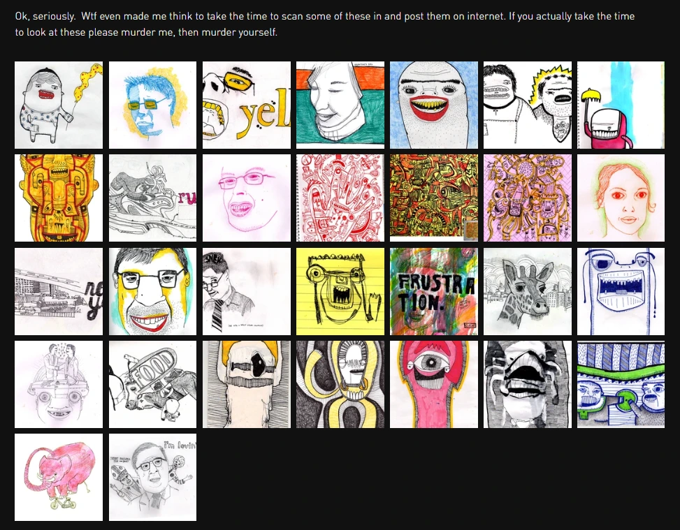초기에는 그림을 막 배우고 연습하는 단계로 주변 인물이나 관심 있는 소재를 자유롭게 그립니다. 첫 그림은 비플의 삼촌인 제임스를 그렸는데 그 후로는 그림 연습을 하는 느낌으로 주변 인물이나 상상한 무엇인가를 그립니다. 그중에는 조잡한 성적 이미지, 조롱, 인종주의적 시각마저 엿보이는 20대였던 비플 머릿속의 온갖 잡동사니를 구경할 수 있습니다. 비플 스스로도 매우 부끄러워하는 드로잉이지만 매일 하나씩 만들어가야겠다는 약속을 지켜나간 증거이기도 하므로 모두 공개해 놓았습니다. 공개는 어쩔 수 없이 했지만 제발 아무도 안 보았으면 하는 절실한 바람이 느껴지는 작가의 코멘트도 달려 있습니다.