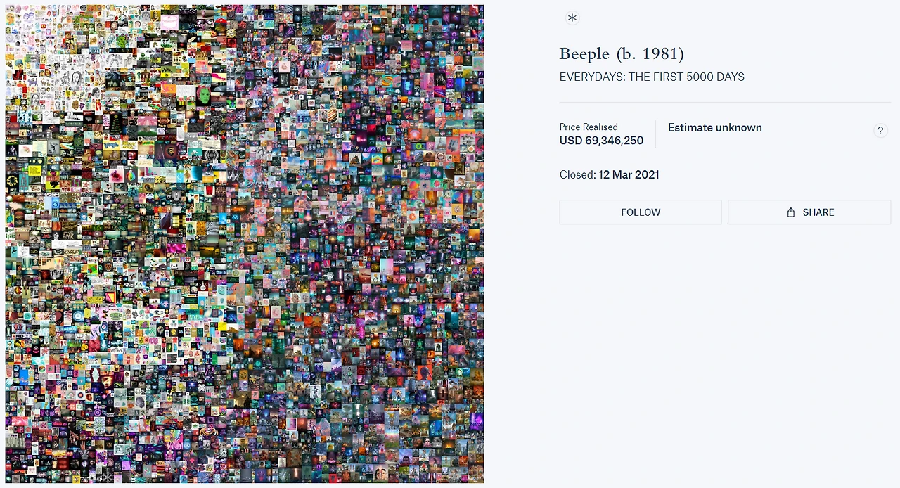 'Everydays: The First 5000 Days'는 Everyday에 -s를 붙여 매일의 노력이 켜켜이 쌓였음을 나타냅니다. 한 조각 한 조각 역사가 되어 네모의 픽셀에 자리 잡은 것이죠. 이 작품은 2021년 2월 25일부터 3월 11일까지 크리스티에서 경매가 진행되었어요. 시작가는 100달러. 경매에는 약 2,200만 명이 참여했는데 2주 만에 6,934만 달러에 낙찰되면서 NFT작품 사상 최고가를 기록합니다. 유명 암호화폐 트론(TRON)의 창업자 저스틴 선(Justin Sun)도 입찰액 5천만 달러로 경매에 참여했으나 낙찰에는 실패했어요.