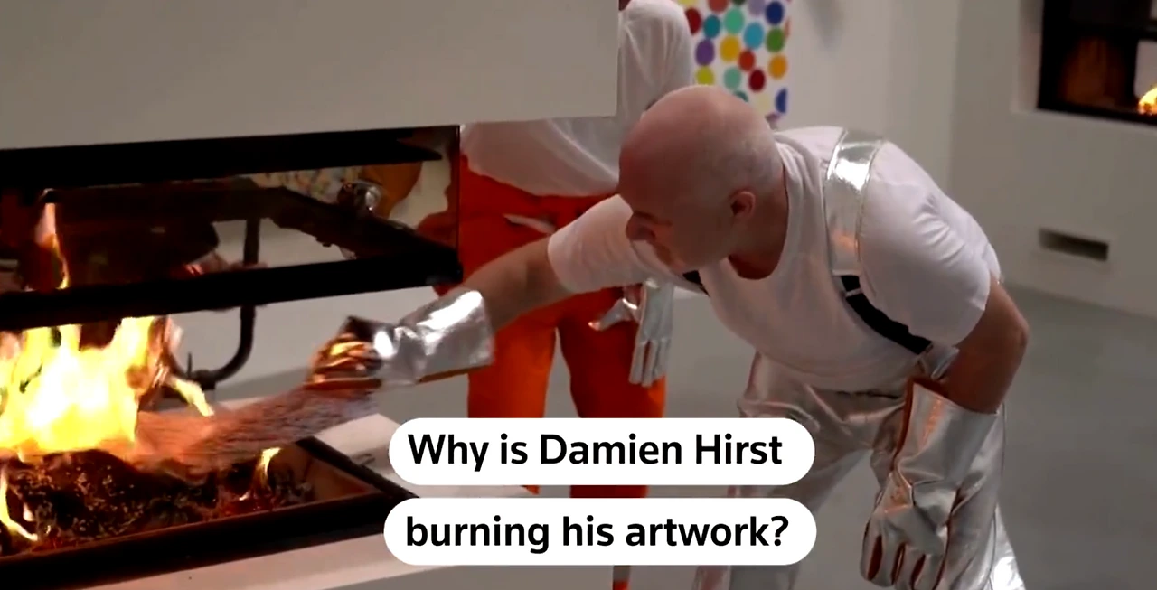 Artforum.com어찌 됐건 NFT를 선택한 사람들의 1:1 매칭이 되는 실물 작품은 모두 소각되었습니다. 데미안은 직접 방화복을 입고 여러 작업자들과 함께 수백 개에 달하는 작품을 소각로에 넣으며 이 장면을 소셜 미디어로 생중계합니다.