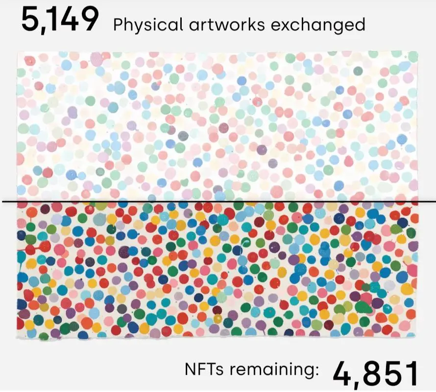 짜잔. 1년 후 결과가 나왔습니다. 4851 VS 5149. 어느 쪽이 많을까요? 구매자 중 4,851명은 NFT 작품을, 5,149명은 종이로 제작된 실물을 선택했습니다. 얼핏 비슷한 비율로 선택한 것 같죠? 하지만, 1만 개 중에 1천 점은 처음부터 데미안 본인이 자신의 소유로 할당해 놓은 상태였습니다. 그리고 데미안은 자신이 소유한 1천 개 전부를 NFT로 선택해서 자신의 의견을 간접적으로 표명합니다. 결과적으로 NFT를 선택한 사람은 3,852명, 실물을 선택한 사람은 5,150명이라고 보아야 합니다. 또 한 명이 여러 개의 NFT를 보유한 경우도 있기 때문에 그마저도 정확하다고 할 수 없습니다. 하지만 실물을 선택한 사람이 많다는 점은 확실합니다. NFT보다 실물 작품이 더 가치 있다고 생각하는 사람이 많은 것입니다.
