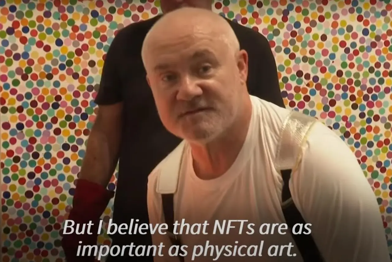 데미안 허스트(오른쪽)와 찰스 사치(왼쪽) | The guardian찰스 사치는 벤처 투자자(VC)의 역할을 했다고 볼 수 있습니다. 떡잎이 남다른 초기 예술가를 후원하고 작품을 수집한 후 세계 최대 광고회사(Saatchi & Saatchi)를 키워냈던 마케팅 역량으로 흥행에 불을 지피는 것입니다. 데미안은 사치의 든든한 후원으로 본격적으로 성공 가도를 달리는데 후원을 받는다는 것은 후원자에 대한 책임을 의미하기도 하므로 비즈니스에 신경을 쓸 수밖에 없었을 겁니다. 그런 데미안 허스트가 NFT에도 진출합니다.