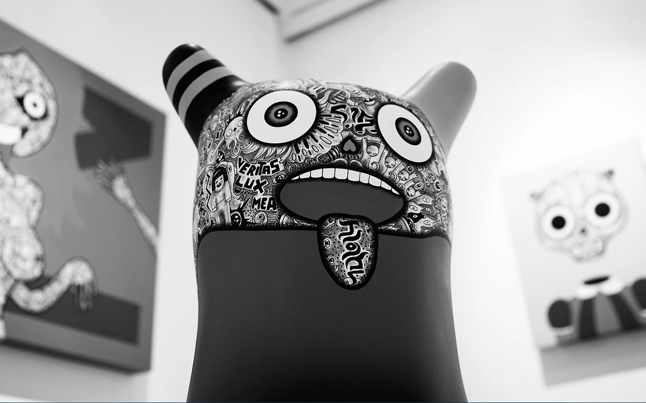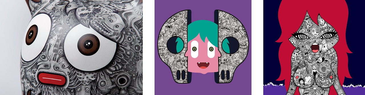 Potmork4cm 크기의 이 작은 예술 작품을 만들고 주위의 아트 갤러리와 디자인 숍 등에 전시했는데 금방 매진되었다고 해요. 시장성 테스트 완료. 이후 이를 디지털로 전환하면서 Potmork의 두개골과 사람의 얼굴을 합성해 현재 해커타오의 트레이드마크 디자인이 탄생합니다. 사람 얼굴 윤곽을 한 명이 디자인하고 그 얼굴 안에 들어가는 그림들을 다른 한 명이 그려 넣으며 역할을 분담해 작품을 만든다고 합니다. 음과 양, 안과 밖, 이미지와 내러티브. 그리고 조화. 해커타오의 일관된 철학이 엿보입니다.