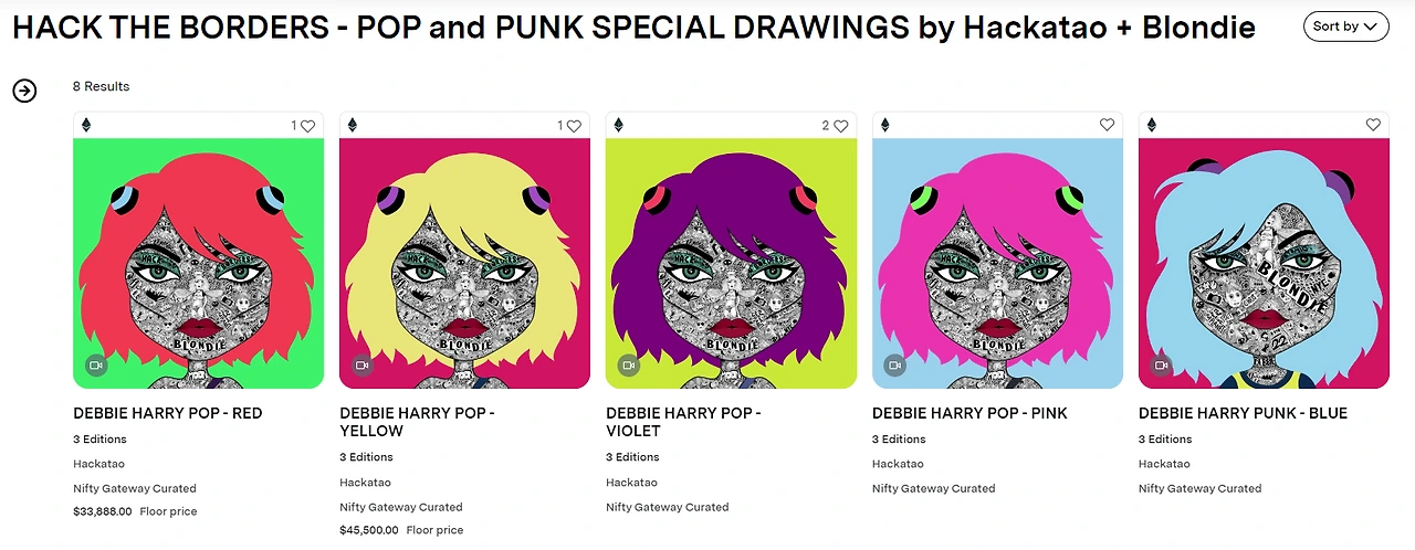 무엇을 생각하든 모두 괜찮습니다. 우리는 작품을 감상하고 이야기를 들으며 재미있고 행복한 시간을 보내면 그만이니까요. 이 작품들의 배경 음악에는 데비 해리가 직접 쓰고 말한 시와 크리스 스타인의 반주가 포함되어 있으니 소리를 들으며 감상해도 좋습니다. HACK THE BORDERS는 니프티 게이트웨이라는 NFT 아트 플랫폼에서 총 3개의 컬렉션, 12종의 NFT로 만들어져 당일 모두 판매되었는데, 현재 가장 저렴한 작품은 1,200달러, 가장 비싼 작품은 5백만 달러에 구매가 가능합니다.