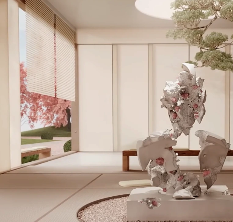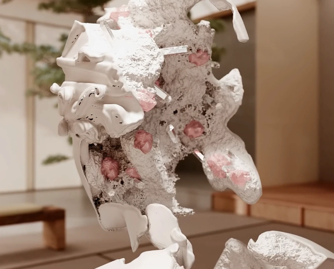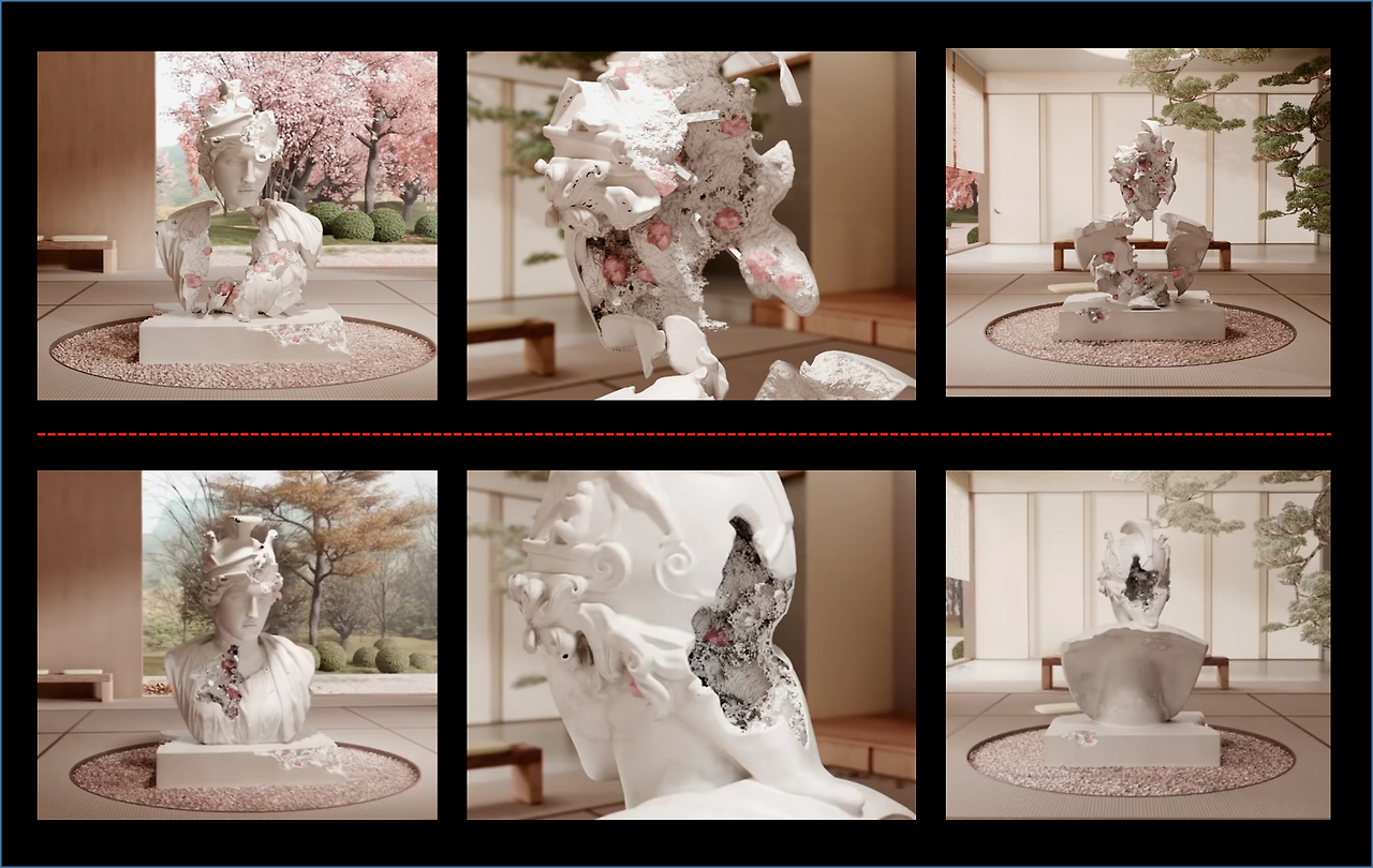 작품을 자세히 들여다보면, 조각상의 파괴된 부분에서는 핑크 빛의 무언가가 반짝거립니다. 바로 수정(크리스탈)입니다. NFT뿐만 아니라 실물 조각 작품들에서도 침식된 부분에 수정을 배치한 것을 자주 볼 수 있는데요. 수정은 아름답기도 하지만 물과 만나면 점점 자라나는 성질을 갖고 있기 때문에 부식된 공간을 수정으로 채우는 것은 재생을 의미하는 것으로 보입니다. 마치 상처가 난 곳에 새 살이 나오듯 수정의 성질을 이용해 회복과 치유의 가능성을 상상케 하는 것이죠. 소멸과 함께 새로운 탄생을 목격함으로써 우리는 상실의 좌절감이 아닌 '순환의 원리'를 깨닫게 되는데요. 소멸과 재구성, 좌절과 희망의 순환은 '삶이 그대를 속일지라도'라는 푸시킨의 시를 연상케 합니다.