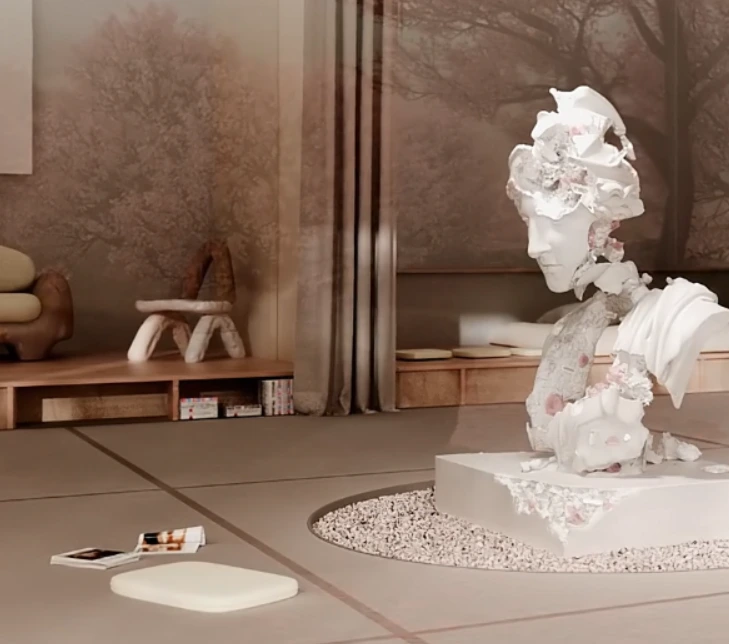 조각상 앞에 책이 두 권 있습니다. 두 권 중 한 권의 책은 돌아오자마자 다시 읽겠다는 의지를 보여주려는 듯 책의 한쪽을 둥글게 말아 읽던 페이지를 열어두었군요. 마치 방금 전까지 옆에 놓인 방석에 누군가 앉아서 책을 읽고 있었다는 듯이 말이죠. 다소 심심할 수도 있는 배경에 방석과 펼친 책만으로 작품에 생동감을 주고 온기를 불어 넣습니다. 사람의 흔적. 이 공간이 단순히 작품을 돋보이기 위함이 아닌 사람의 호흡과 기억이 머무르는 '현재성'과 '현장성'의 공간임을 암시합니다. 시간의 흐름에 따른 쇠퇴와 재생의 무한한 순환을 나타내는 조각상과, 유한하지만 실재하는 우리들의 자취를 같은 공간 안에 밀도 높게 표현했습니다.