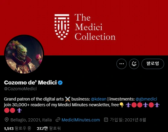 그중에서도 코조모는 NFT에 대한 다양한 의견을 내고 수많은 아트를 수집하는 유명한 고래(고가의 NFT를 대량으로 수집하는 개인이나 조직을 뜻하는 NFT용어) 수집가입니다. NFT예술에 대한 깊은 애정과 높은 이해도를 바탕으로 매주 ‘MEDICI MINUTES’라는 NFT 뉴스레터를 발행하는 대형 인플루언서이기도 하죠.