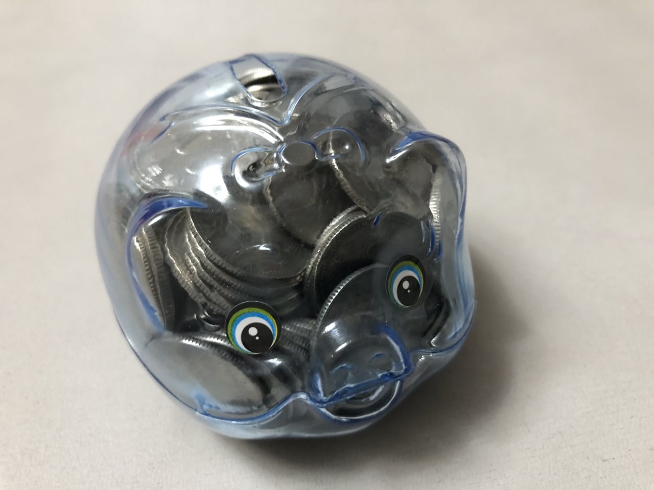 "꼬야야, 이제 돼지가 동전 너무 많이 먹어서 넣을 자리가 거의 없네. 들기도 힘들어. 봐봐."
