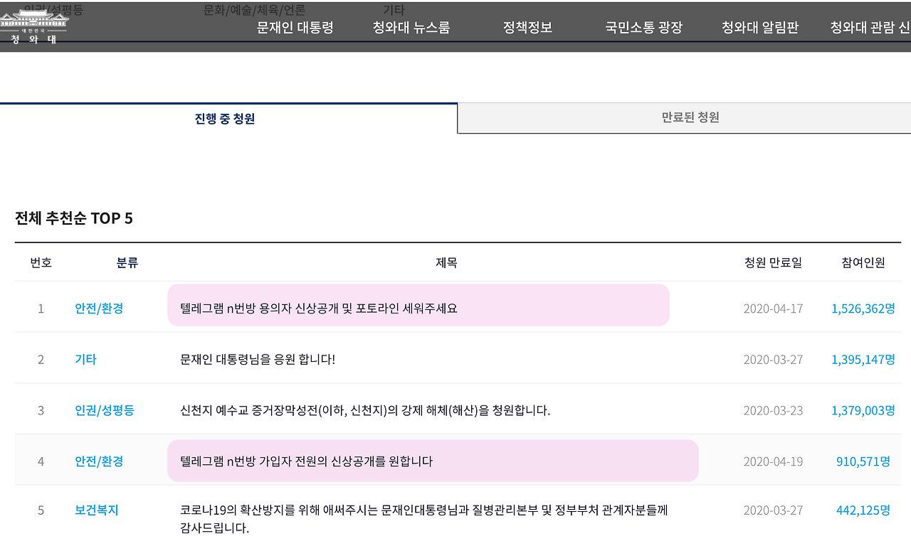 응, 내가 톡 보내준 거 그 기사 링크 봤구나? 국민청원도 했어? 어우 나도 방금 보고 너무 열받아서 보낸 거야. 지금 아는 사람들한테 다 공유하고 있거든. 그러다가 정우엄마 생각나서. 아... 몰랐다구? 어머 그랬구나. 응, 작년 11월쯤부터 터진 일이고, 언론에 보도가 여러 번 됐었어. 기자들이 먼저 보도하고 그리고 나서 경찰 수사 시작한 거 같고, 보도되고 나니까 그 n번방인지 뭔지 없애고 다른 방 만들고 그런다고 어쩌고 하더니, 얼마 전에 박산지 뭔지 그 방 운영자가 잡혔대. 응, 청원은 그 운영자 신상공개 해달라는 거고. 어 그렇지 당연한건데 이렇게 안 하면 안하는 사회라니까. 아, 그리고 n번방 가입자 전원 신상공개 청원도 새로 올라왔어.