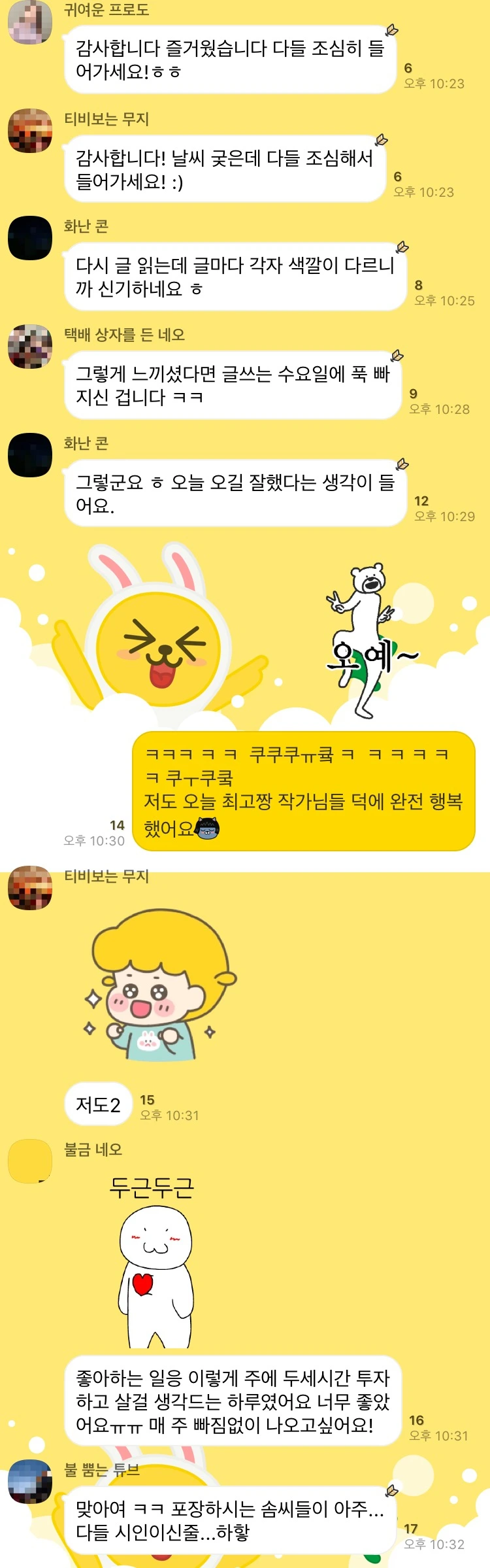 ps. 집으로 돌아오는 길에도 뿌듯함을 마구마구 안겨주는 카톡들. 글도 쓰고 좋은 인연도 만들고 얼마나 좋은지 - 왜 이제서야 했을까. 오픈카톡방으로 매주 주제를 올리고 모임이 끝나면 그 날 쓴 글을 올리고 있어요! 모임 장소는 서울의 강서구이지만,