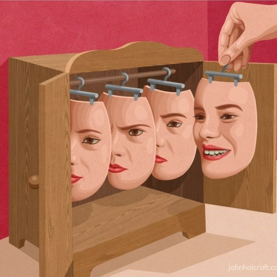 매일 옷을 갈아입듯 표정을 갈아 끼우는 것은 또 어떤가. 개인적으로 어떤 일이 있던 간에 원데이 클래스를 진행할 때는 세상 행복한 사람처럼 웃어야 하는 나로서는 이 그림에 오래 시선이 갔다. 나뿐일까. 우는 아이를 떼어놓고 출근하는 엄마들도, 지옥철을 빠져나오며 새로 산 재킷의 단추가 떨어진 멋쟁이 신사도 주간 회의 때는 프로페셔널한 대리님 가면을 써야 하는 것을.
