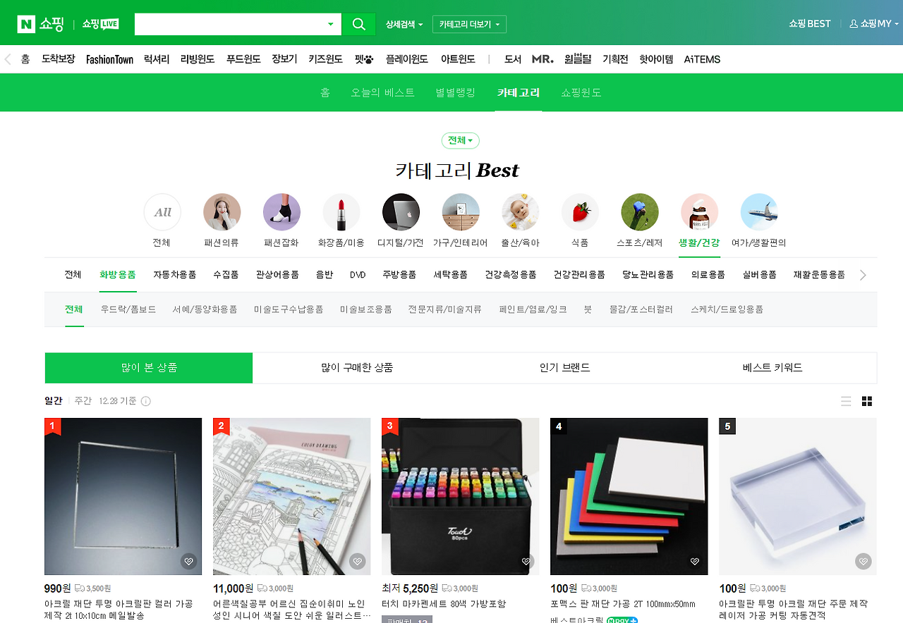 네이버 > 쇼핑BEST > 카테고리 > 내가 속한 카테고리로 들어가면 일간, 주간 순으로 많이 본 상품, 많이 구매한 상품, 인기 브랜드, 베스트 키워드를 볼 수 있다.