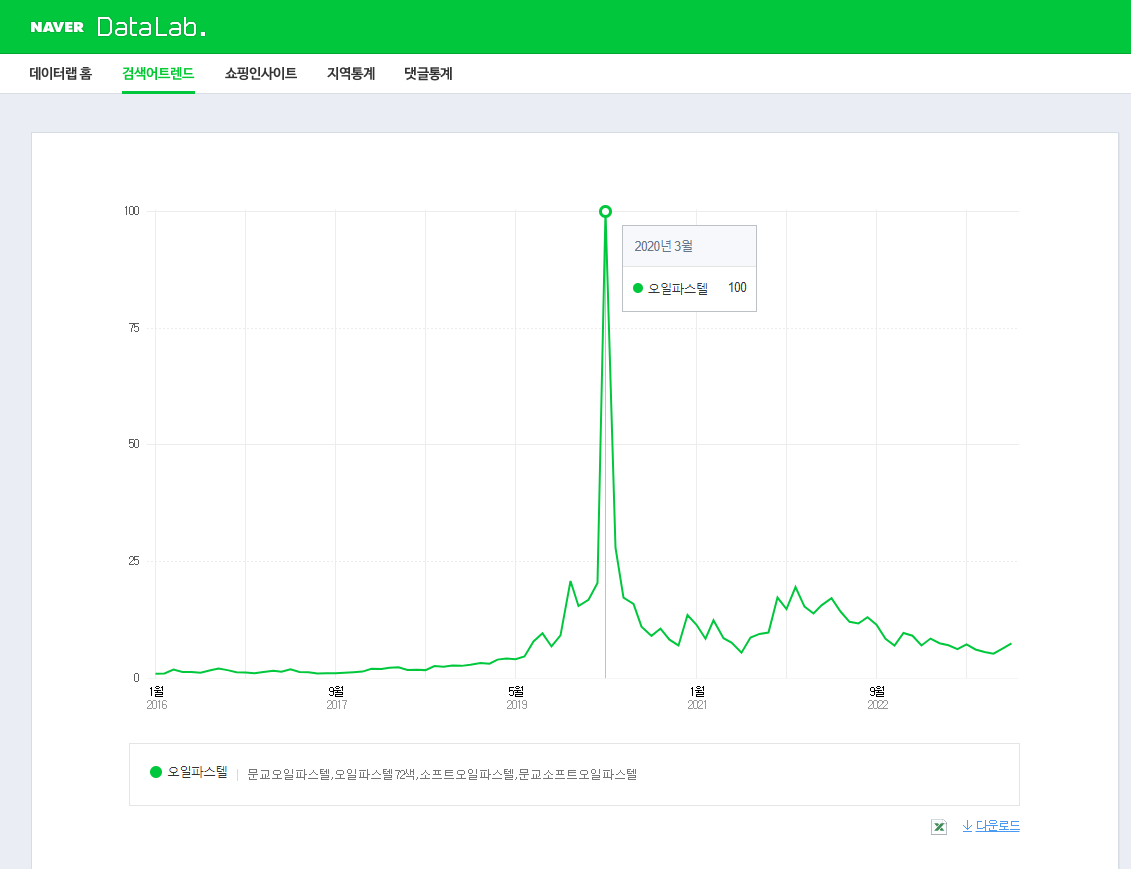 어쨌든, 다시 첫 제품을 선택하는 그 날로 돌아가보면 - 다른 모든 화방용품 중에 오일파스텔, 중에서도 [문교 오일 파스텔 72색]에 대한 키워드 경쟁률이 300%로 비교적 낮았다. 물론 낮은 경쟁률은 아니지만 3,000%에 비하면 훨씬 낫다. 게다가 이 낮은 경쟁률을 매력적으로 보이게 했던 가장 결정적인 이유는 내가 코로나가 덮친 미술 공방에서 바닥을 긁던 2020년의 봄, 이 때가 바야흐로 오일파스텔의 전성기였기 때문이다.