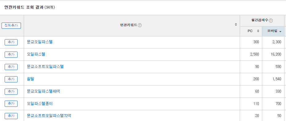 그래도 가장 낮은 경쟁률이니 이번엔 오일파스텔 키워드로 다시 한 번 연관 검색어를 찾아봤다. 검색량 내림차순으로 보다보니 조금 경쟁강도가 낮은 키워드들이 보이기 시작했다. [오일파스텔]은 넘사벽이지만 [문교오일파스텔]은 그보다 조금 낫고 [문교소프트오일파스텔]은 그보다 또 조금 나은 식. 사실은 모두 같은 제품인데 이 중 경쟁이 낮은 키워드부터 상위노출해서 조금씩 판매가 되다보면 나중에는 더 큰 키워드에서도 상위에 올라갈 수 있지 않을까?