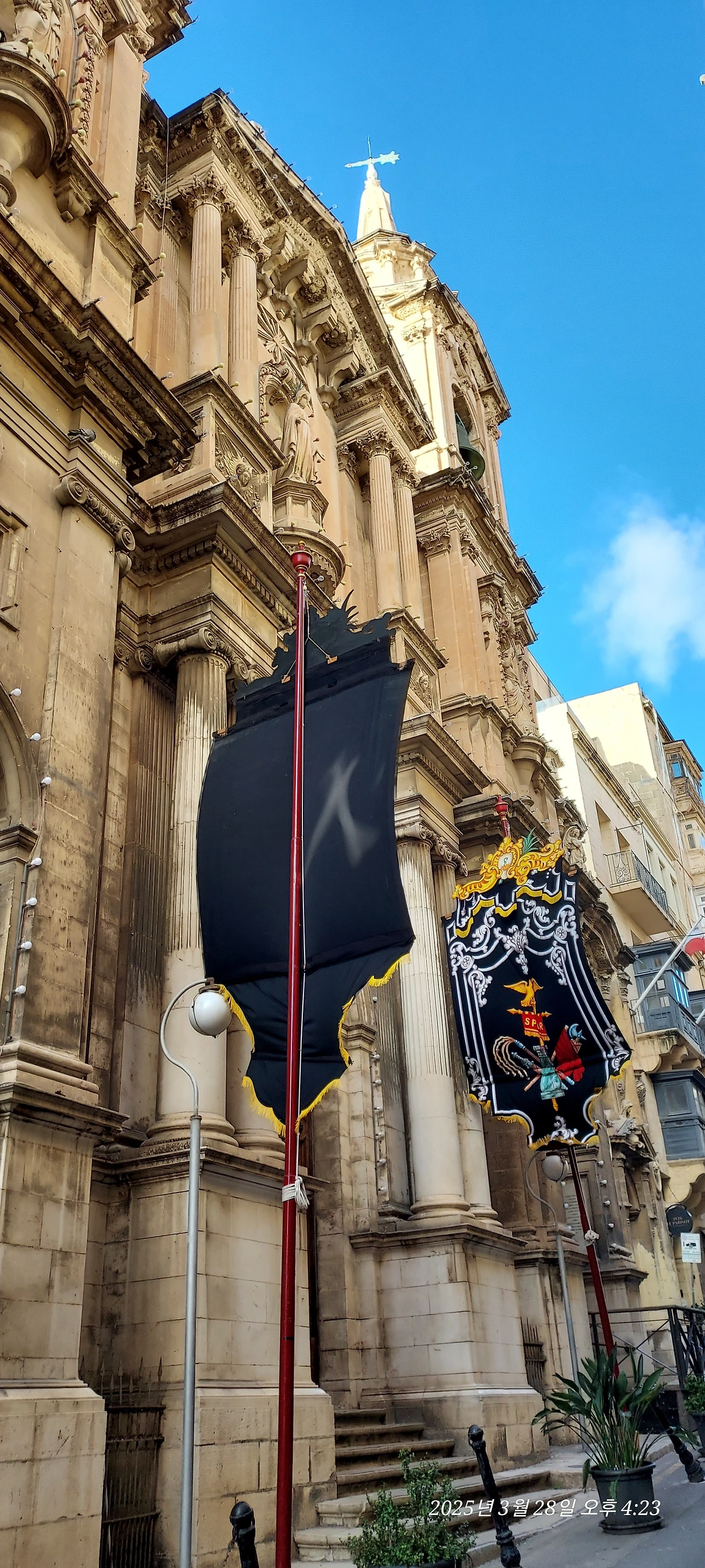 새로운 골목길로 접어드니 좁은 골목과는 어울리지 않는 엄청난 규모의 성당이 눈앞에 나타난다. 휘장마저 나를 눈여겨보라는 듯 휘날린다. 여기가 바로 성바울난파선교회(st. Paul's shipwreck church)다. 내가 잘못 명명한 교회가 이 골목에 있었다. 성바울성공회대성당과는 걸어서 10분도 안 되는 거리에 있지만, 그 역사와 규모와 개방성은 차원이 다르다. 이곳은 시간이 늦어서인지 문이 굳게 닫혀있고, 쉽사리 일반인의 예배를 허락할 것 같지도 않다. 사도 바울의 오른팔 뼈와 그가 처형당할 때 사용되었던 대리석 기둥의 일부가 남아있는 교회라고 한다. 이름 그대로 사도 바울이 난파되어 몰타에 머물렀던 걸 기념하기 위해 새워진 교회다.
