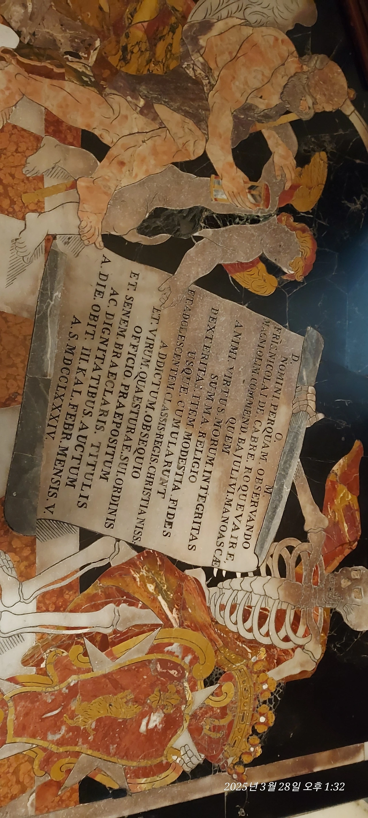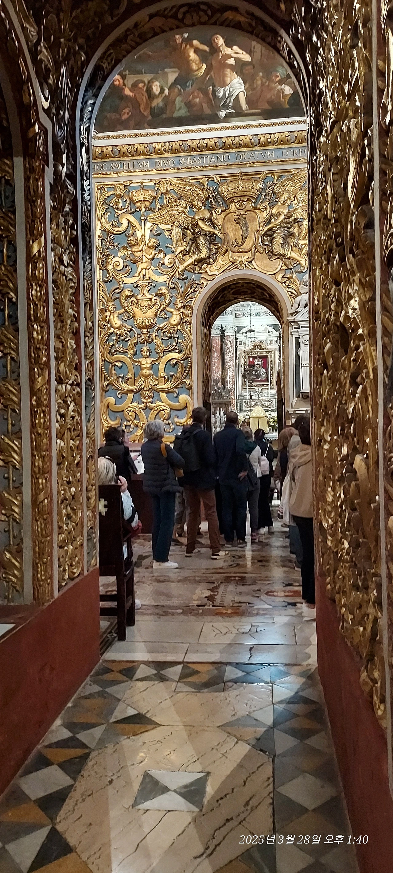 성당의 내부는 금빛으로 빛났고, 온갖 화려한 색상으로 여백 없이 장식되어 있다. 이곳이 유독 화려해 보이는 것은 바닥 때문인 것 같다. 기사단을 구성했던 8개 국가의 개별 예배당은 서로 다른 휘장과 문장, 조각과 그림으로 꾸며져 있고, 교회 전체 바닥에는 400명의 기사단 묘지가 각각 다른 색과 무늬로 장식되어 있다. 놀라운 것은 그 모든 글귀와 문양들이 대리석으로 표현되어 있다는 사실이다. 각기 다른 색깔의 돌로 천사, 해골, 농담, 유언, 업적, 문장 등을 새겨 죽은 기사들을 추모한다. 성당 내부로 들어온 사람들은 400명 기사의 묘 위를 밟고 다니는 거다. 또한 성당의 천장은 세례자 요한의 일대기가 가득 그려져 있다. 바닥, 천장, 벽 할 것 없이 빈틈이 없으니 숨이 턱 막힐 수밖에 없다. 기사단 묘 위를 걷는 한걸음 한걸음, 경건해질 수밖에 없다.
