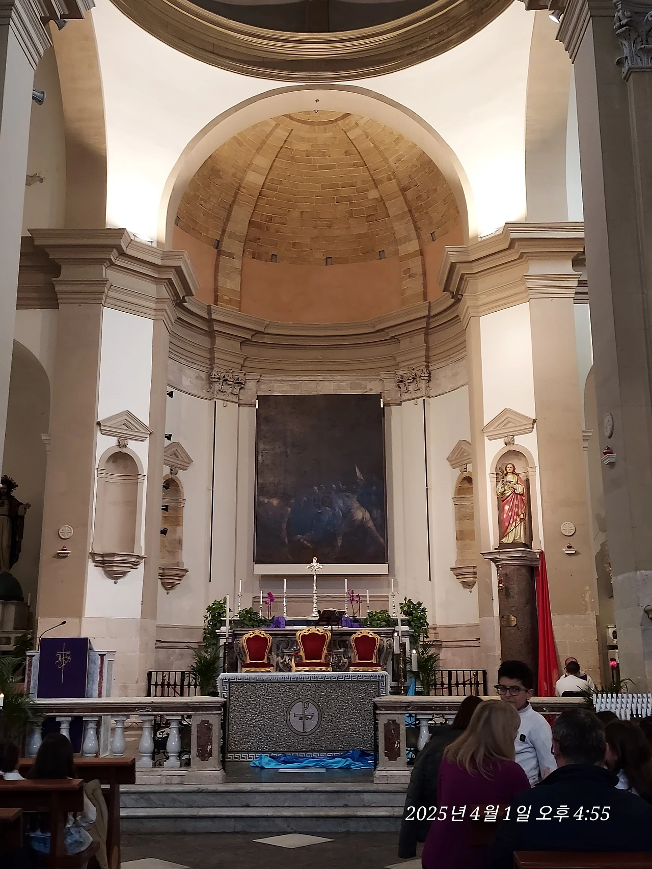 성당 문은 활짝 열려있고 예배를 보는지 사람들도 꽤 많았다. 보통은 예수님 상이나 십자가가 놓여있을 성당 정면 한가운데 카라바조의 '성 루시아의 매장' 그림이 걸려있다. 성당의 제단화로 받쳐진 거다. 성당 안 사람들은 그림에는 관심도 없고 자신들의 행사에 집중하고 있다. 아이들이 단체로 세례를 받는 건지, 아니면 교리공부 검사를 받는 건지, 스무 명쯤 되는 아이들이 하얀 티를 입고 신부님과의 면담을 기다리고 있었다. 아이들을 기다리는 학부모들은 늘상 있는 일이라는 듯 우리에게는 별다른 관심을 보이지 않는다. 그들은 그들의 행사를 진행하고 우리는 최대한 제단 앞 가까이 가 그림을 본다.