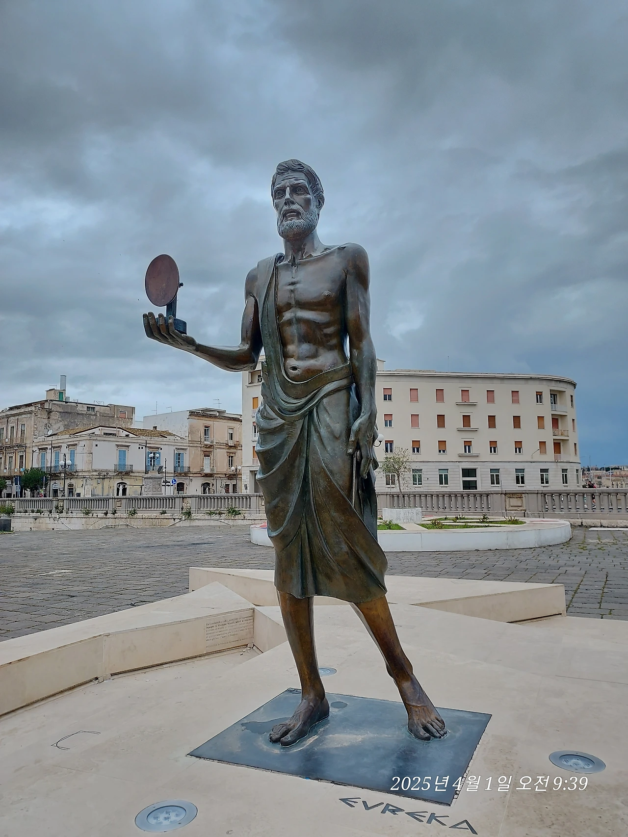 풀리지 않았던 과제가 목욕 중에 해결된 게 사실인지, 그의 동상은 속옷만 걸친 모습이다. 기원전 로마로부터 시라쿠사를 지켜낸 수학자답게 그의 손에는 컴퍼스와 포물면 거울이 들려있다.