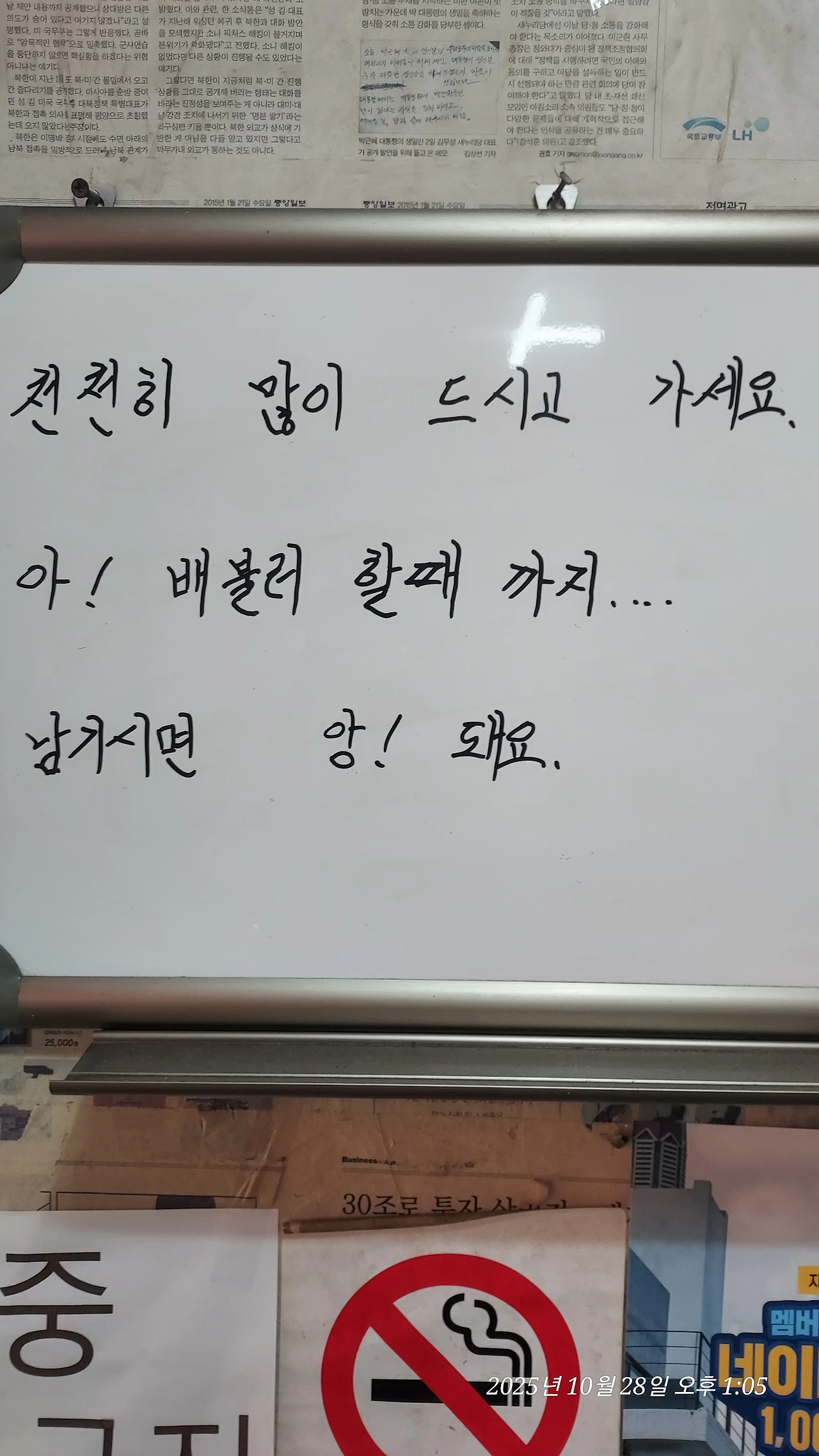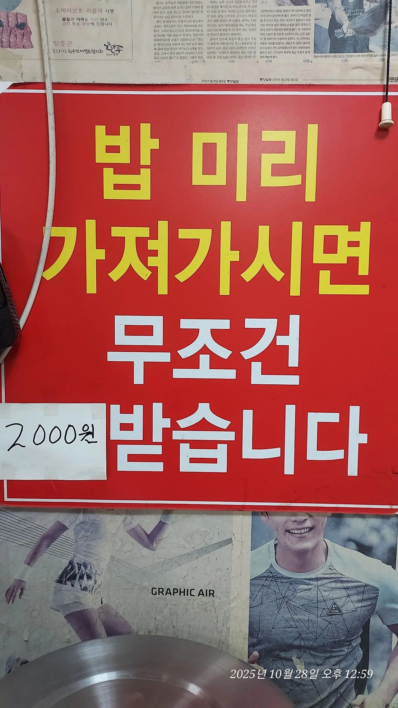 음식을 남기면 벌금을 내야 하기에, 밥통의 밥은 칼국수를 다 먹은 후에 담아 가도록 큰 글씨로 공지하고 있다.