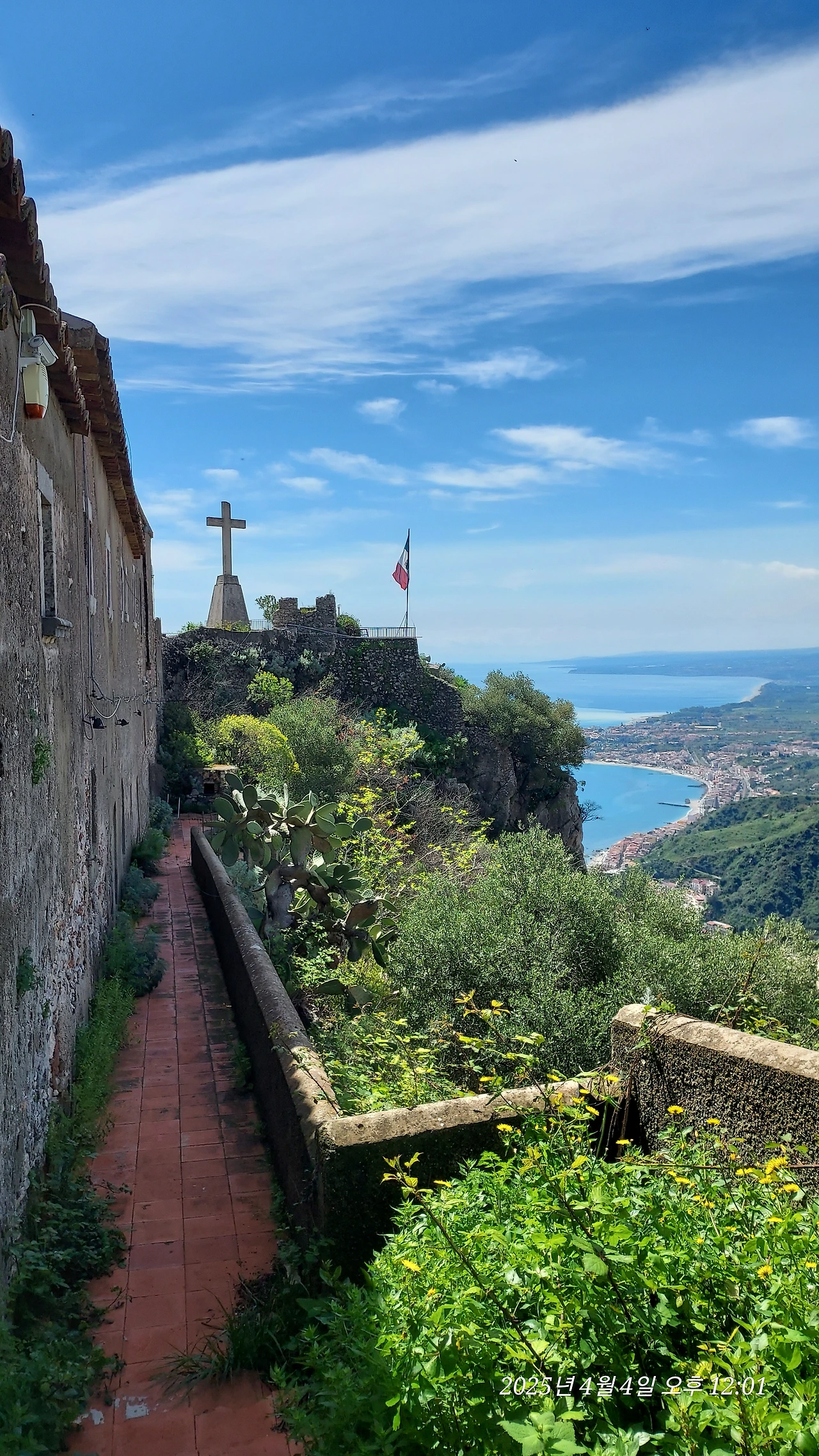 높은 지대에 꼬불꼬불 골목길로 도시가 형성되어 있어서 숙소 찾는데 애를 먹었지만, 나흘 머무는 내내 행복했다. 도착하는 날은 동네 구경을 하고, 하루는 이솔라벨라로 나와 바닷물에 발을 적시고, 또 다른 하루는 에트나 화산을 보며 마을 꼭대기 동굴 성당과 십자가 성당으로 트레킹을 한다. 그냥 잠들기 아쉬워 저녁 산책을 나가기도 했다. 숙소에서 두오모 광장으로 나오는 데는 십 분이면 충분하고, 광장에서는 멋진 바다를 내려다볼 수 있는 데다가 감미로운 음악이 연주된다. 밤이면 멀리 바닷가 건물들의 불빛들이 살아 움직이고, 산꼭대기에 하얀색 십자가가 불을 밝힌다. 카타니아 도시보다 에트나 화산을 더 가까이서 볼 수 있고, 워낙 지대가 높아 에트나 화산에 걸려있는 구름들은 그걸 넘지 못하고 이리저리 옮겨 다니며 모였다 흩어졌다 한다. 넓은 언덕에는 집들이 끼리끼리 몇 가구씩 아담하게 자리 잡고 있고, 작은 거리를 채우고 있는 가게들은 사랑스러울 만큼 아기자기하고 예쁘다.