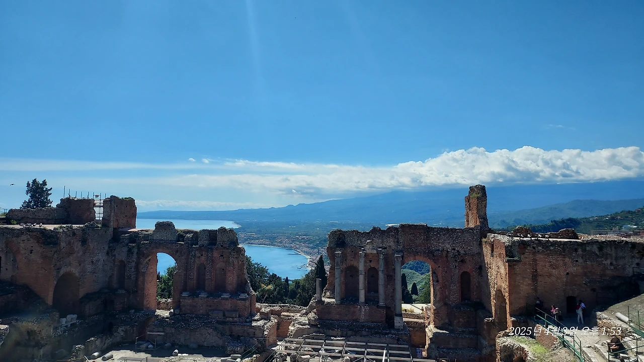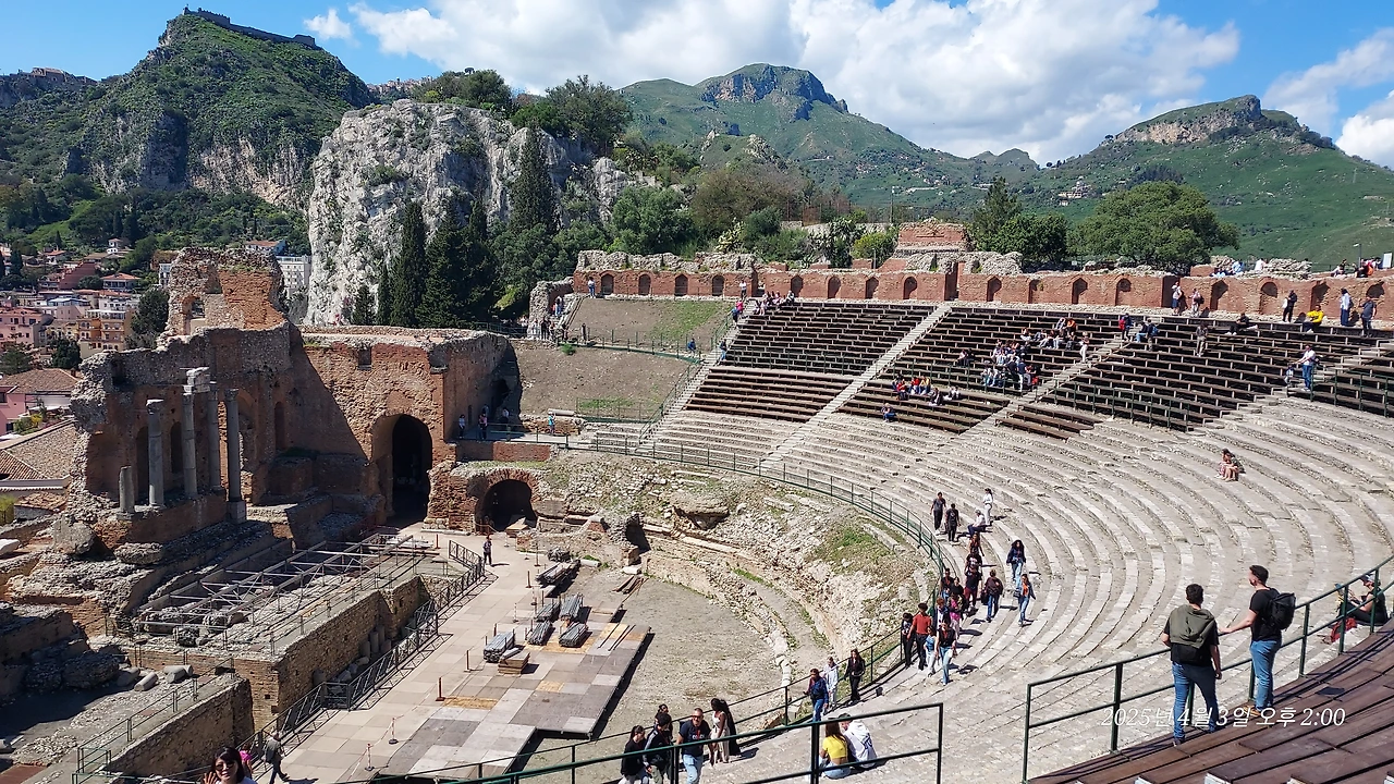 타오르미나의 그리스 원형 극장은 경사진 지형을 활용하여 깊은 좌석을 확보하고, 에트나 화산과 바다를 함께 볼 수 있는 천혜의 장소에 위치하고 있다. 내부로 들어와 보니, 원형 극장의 윗좌석은 추가로 나무를 덧대어 확장해 놓았고, 바다를 정면으로 가리고 있던 구조물은 지진으로 무너지는 바람에 건축물의 일부가 허물어지면서 우연찮게 바다를 바라볼 수 있는 전망이 확보되었다는 걸 알 수 있었다. 그곳에서 해질 무렵 공연이라도 한편 본다면 더할 나위 없을 거라는 생각에 아쉬움을 남긴다. 뜨거운 태양 아래서 모자 하나로 해를 가린 채 칫솔만 한 솔을 들고 기둥에 매달려 있는 사람들을 보면서 복원작업이 계속되고 있다는 걸 알 수 있었다.