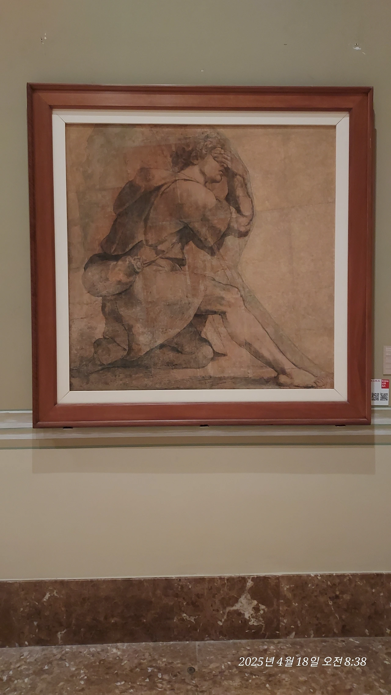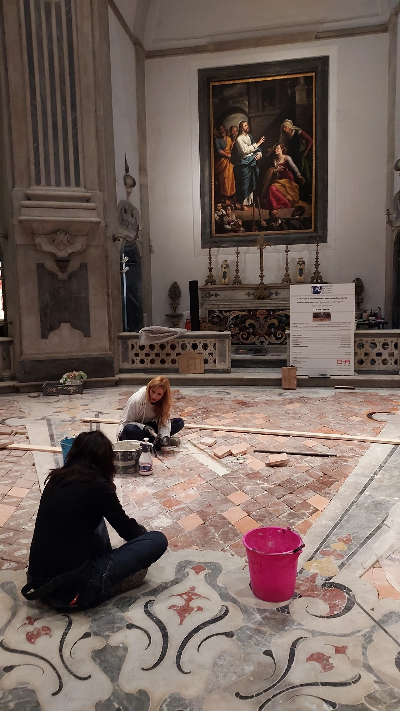 사흘동안 이 그림을 바로 옆집에 두고 지냈다는 게 마치 무슨 소명같이 느껴진다. 작은 예배당 같은 미술관은 관람객을 받으면서 동시에 바닥 보수 공사를 진행하고 있었다. 젊은 여자 두 분이 바닥에 주저앉아 바케스를 옮기면서 손바닥 만한 크기의 돌멩이들을 순서대로 배열하고 있었다. 모자이크 조각에는 하나하나 번호가 매겨져 있다. 그 작업도 행위 예술인 듯 진중하고 신선했다.