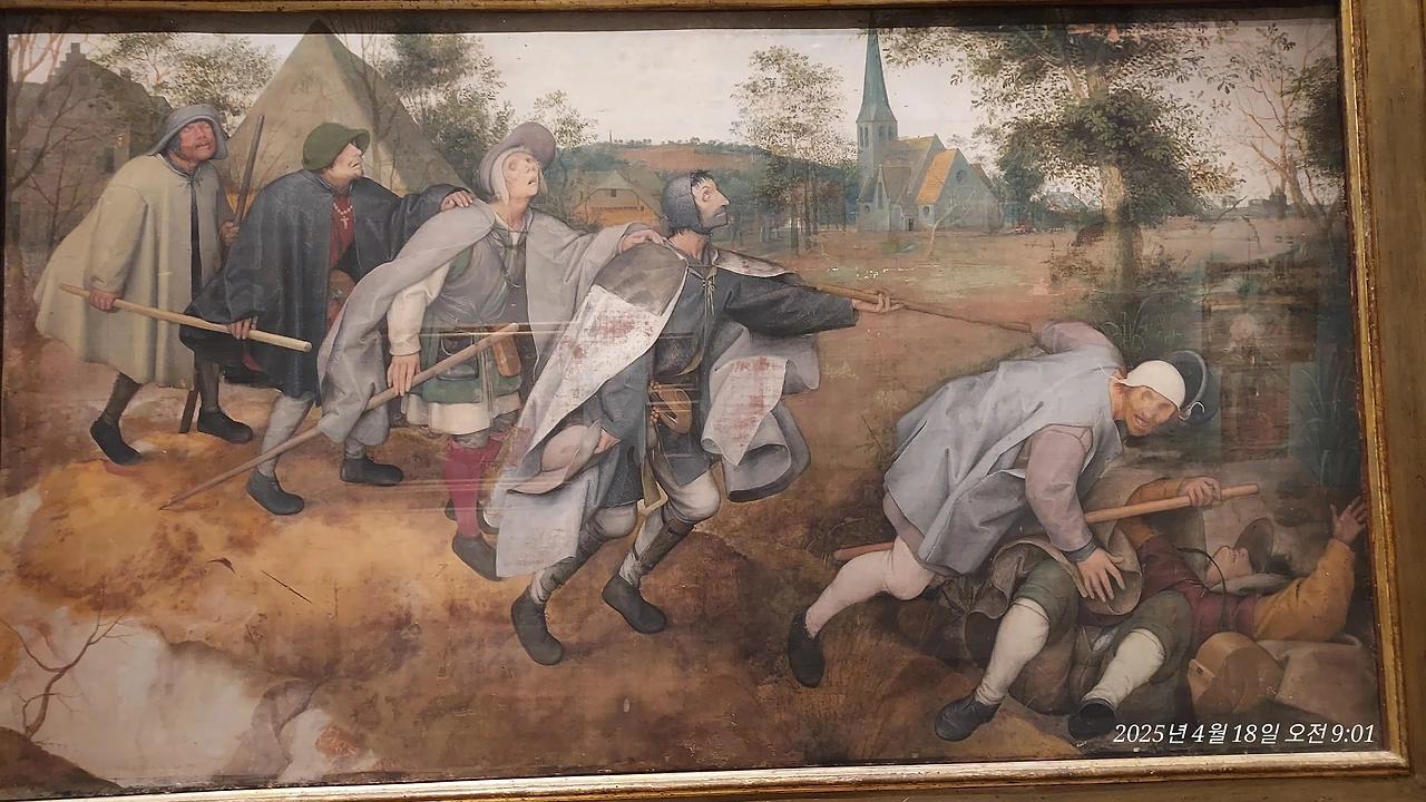 내가 '네덜란드의 속담'이라는 작품을 가지고 수업을 진행한 적이 있는데, 그 벨기에 화가 브뤼겔의 작품도 두 점 있다. 여전히 그의 작품은 유머와 풍자, 풍습을 그리고 있다. 눈먼 자들이 눈먼 자를 따라가다 함께 엎어지는 우스꽝스러운 그림이 여기 있다. 나뿐만 아니라 다른 사람들도 재미있는지 카메라를 들이댄다.