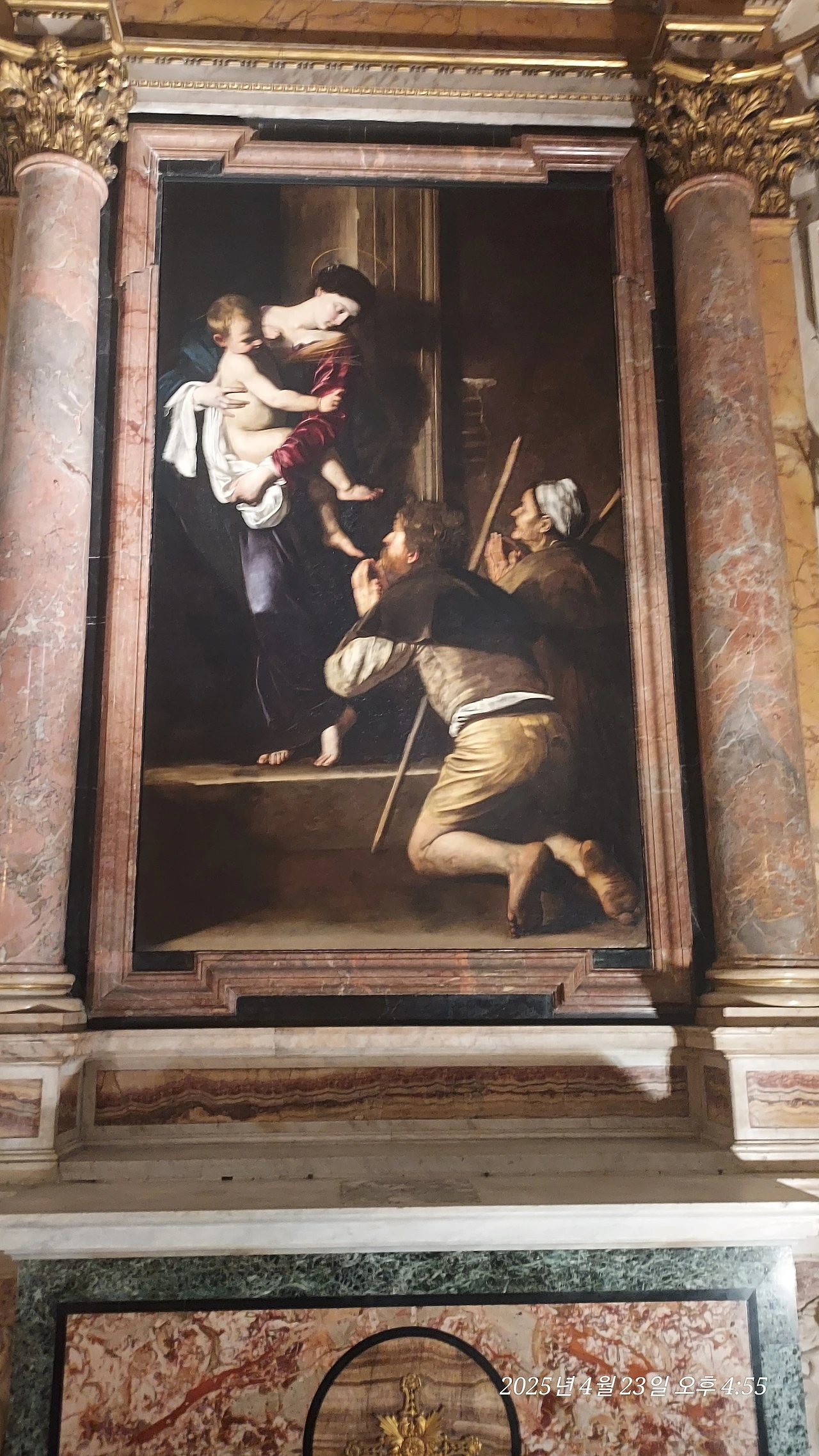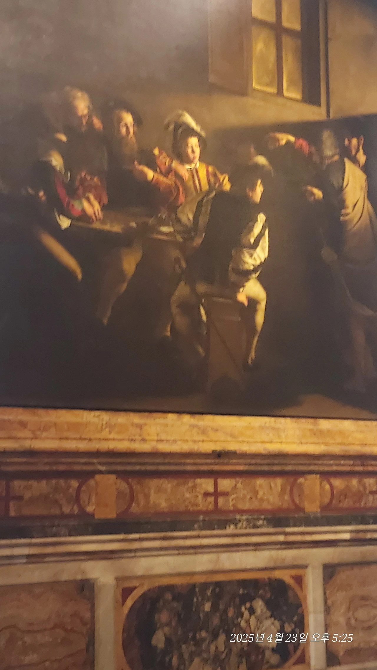 성당에 들어서자마자 왼쪽에 내가 보고자 하는 그림이 걸려 있다. 나는 반가운 마음에 사진부터 한 장 찍는다. 사진을 찍자마자 불이 꺼지고 그림 주변이 어두워진다. 순간 시라쿠사에서의 기억이 떠올랐다. '루치아의 매장' 역시 동전을 넣어 불을 밝혀야 그림을 볼 수 있는 시스템이었다. 나는 누군가 넣은 동전 덕분에 잠깐 카라바조 그림을 볼 수 있었던 거다. 나는 벽에 설치된 기계에 2유로 동전을 넣고 다시 그림을 본다. 주변에 있던 사람들도 내가 넣은 2유로의 혜택을 본다. 그러나 길지 않다. 가이드를 하는 청년도 2유로에, 2유로를 더하여, 자신의 손님들에게 그림을 설명한다.