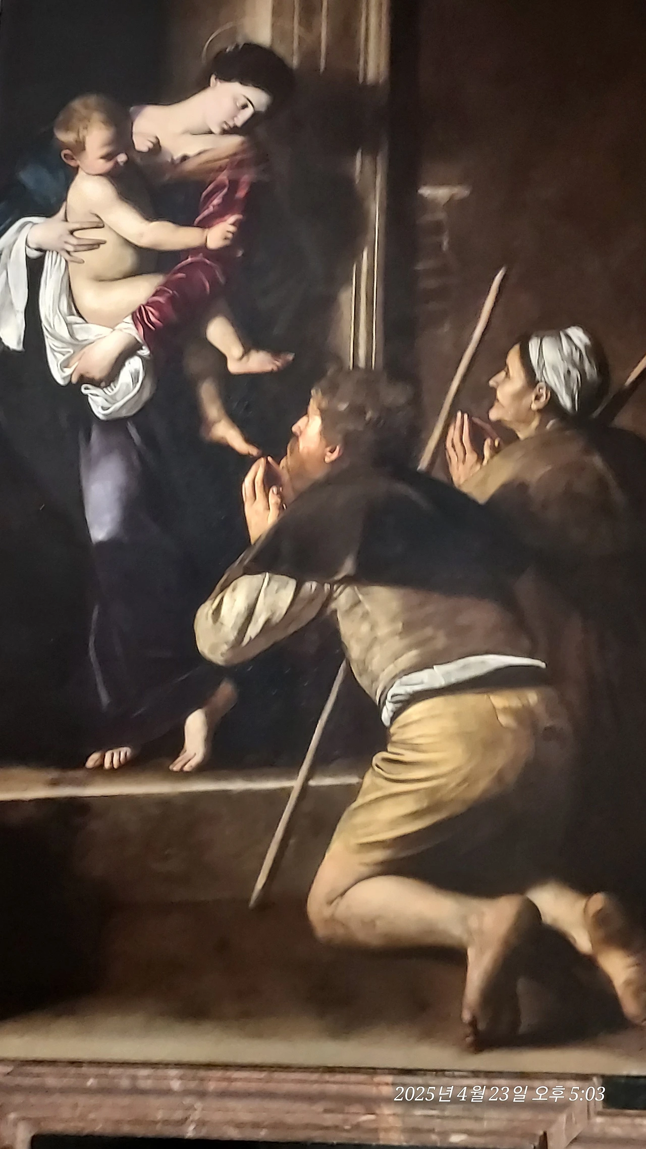 '순례자의 성모'는 예수를 안은 성모 마리아가 문 앞에 있는 두 명의 순례자를 호기심 어린 눈으로 내려다보는 그림이다. 순례자가 무릎을 꿇지 않았다면 마리아는 그저 평범한 이웃집 여인으로밖에 보이지 않는다. 카라바조 그림의 특징 중 하나가 그의 그림에 등장하는 인물들이 평범한 사람들을 모델로 삼았다는 점이다. 지금에 와서는 그 점이 선구자적 시도로 평가받지만, 당시에는 지탄의 대상이 되었다.