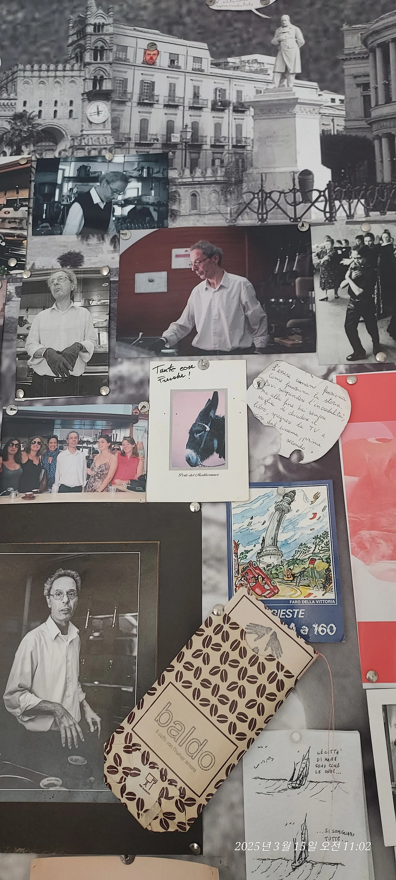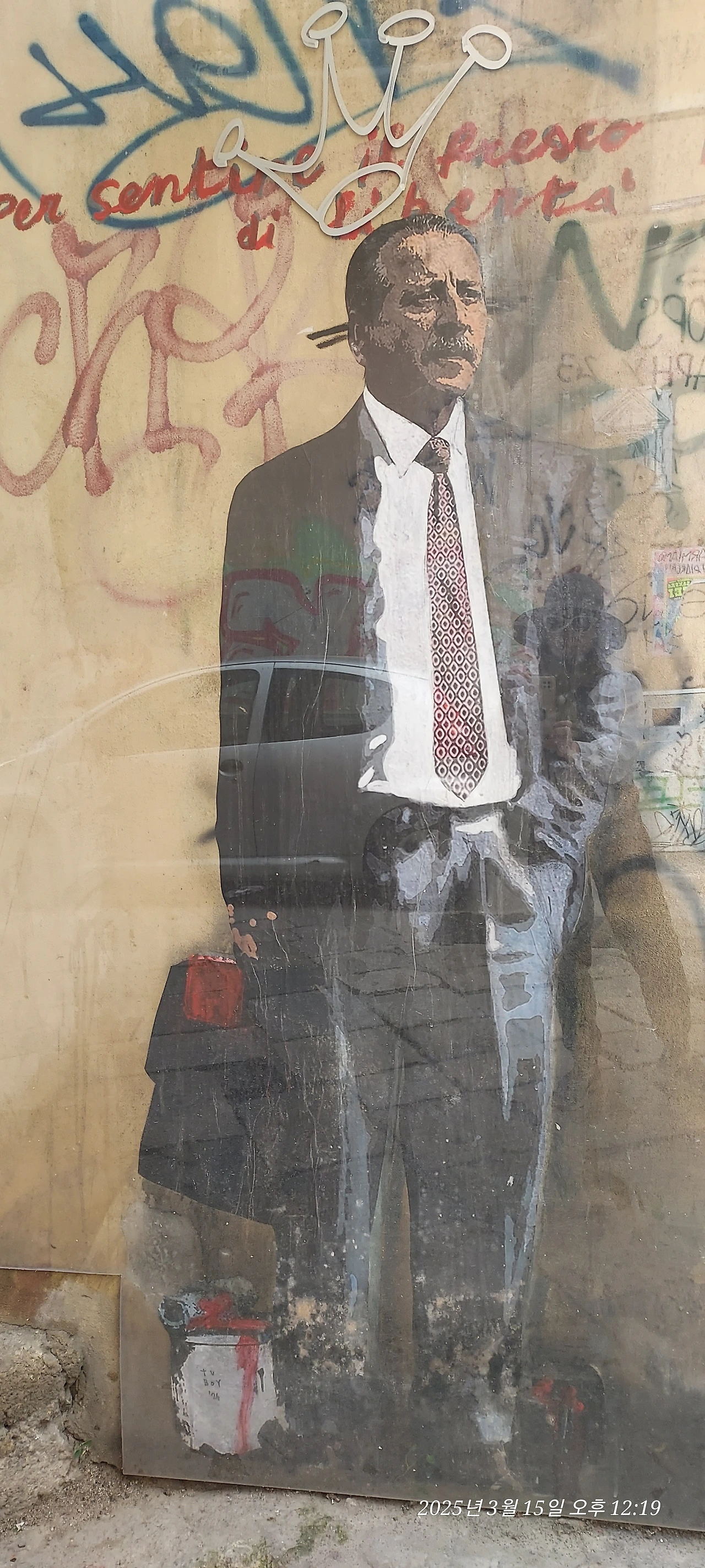 팔레르모 공항 이름으로 명명된 두 사람의 그래픽을 찾아 새롭게 구글맵을 설정한다. 내장버거집에서 채 5분도 안 되는 곳에 두 사람의 얼굴이 건물 벽면을 가득 채우고 있다. 시칠리아의 마피아 조직을 없애는데 기여한 판사들로, 한분은 마피아 조직원에게 살해당했다고 한다. 팔코네 보르셀리노 공항은 이들 두 사람의 성을 딴 것이라고 하니, 인자한 그들의 모습을 한참 올려다본다. 두 분이 이마를 맞대고 웃고 있어서 그나마 조금은 위로가 된다. 다시 에스프레소 명소로 구글맵을 수정한다. 두 번째 방문하는 곳이다. 설거지도 하지 않고 쌓아놓은 커피잔이 이곳의 이정표로 쓰이는 걸 보면서, 본질에 충실하는 게 무엇보다도 중요하다는 사실을 새삼 확인한다. 여유 있는 일정이라 좋았던 곳을 두 번씩 방문하다 보면 처음에는 안 보이던 것이 두 번째는 보이는 경우가 많다. 커피가게 주인의 젊은 시절이 벽면에 사진으로 박재되어 있는걸 두 번째 방문하고서야 발견한다. 젊었던 얼굴에 세월이 묻어나도록 한 곳을 지키고 있는 그에게 사진 찍기를 요청해 보는데 지극히 자연스럽게 포즈를 취한다. 동요가 없고, 여유와 자신감이 보인다.