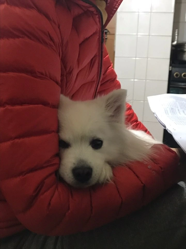 봄이를 데리고 산책에 나서면 마주 오는 사람들의 입꼬리가 올라가는 걸 보게 된다. 봄이는 사람들을 미소 짓게 만든다. 봄이는 새하얀 얼굴에 새까만 눈동자와 새까만 콧방울, 그리고 그냥 있어도 웃는 듯한 입술을 가졌다.