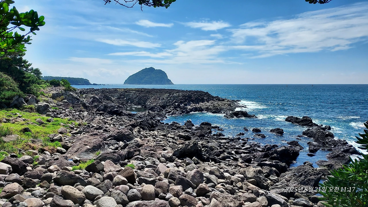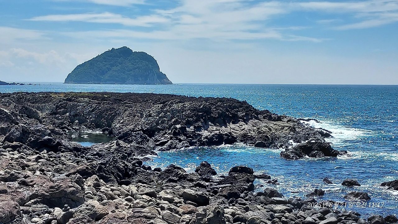 햇빛에 반짝이는 바다는 해안의 검은 돌과 부딪치는 곳에 아기자기한 절경을 만든다.
