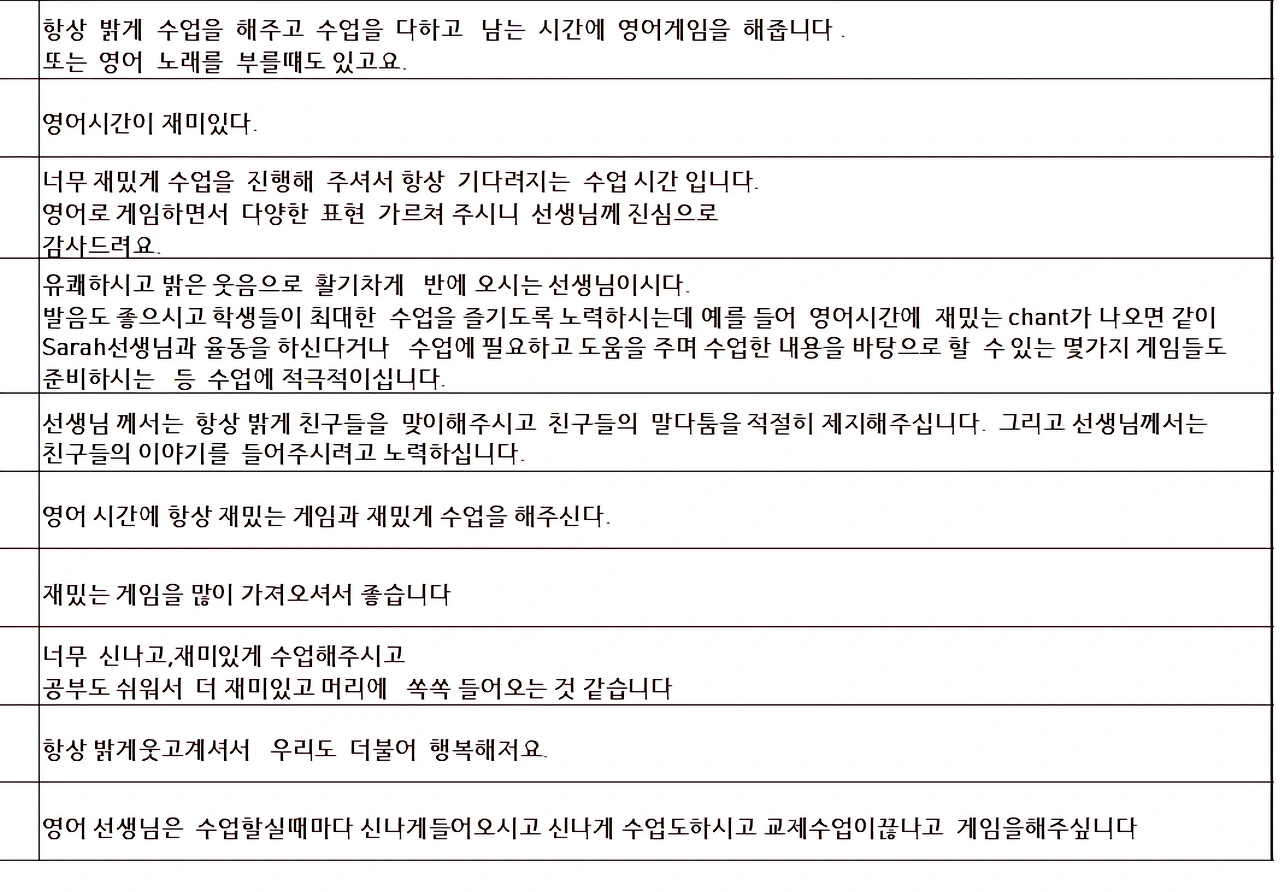 2021년 영어전담교사를 할 때 아이들이 써준 교원평가 내용