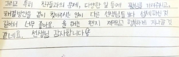 "여기 모인 우리는 엄청난 확률로 같은 반에 모인 소중한 인연이야. 물론 서로 속상한 일이 있을 때도 있지만 그래도 이 친구들 덕분에 올 한 해 기쁘고 행복한 일이 더 많았잖아.
